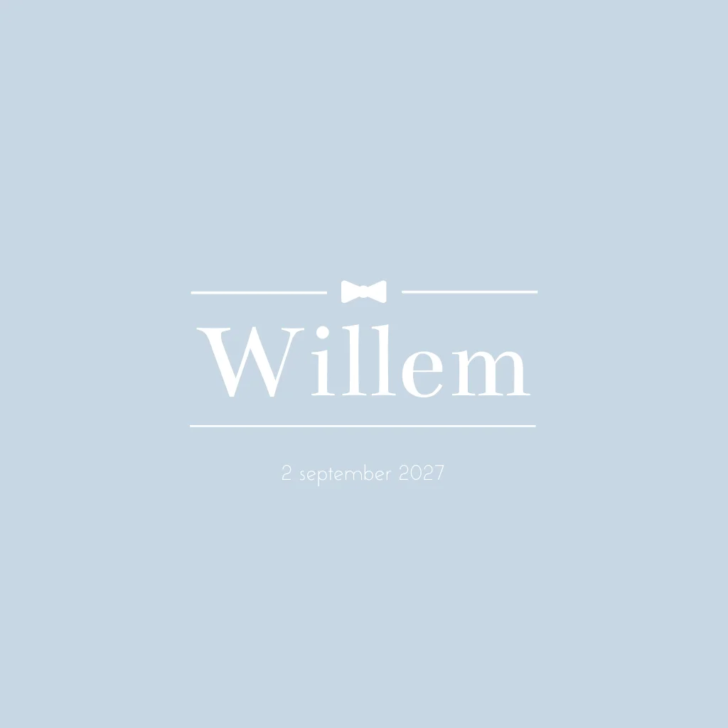 Chique baby blauwe geboorte kaart met wit vlinderstrikje. Wil je geboortekaartje Willem liever in een ander kleur? Kies jouw favoriete kleur in de editor.