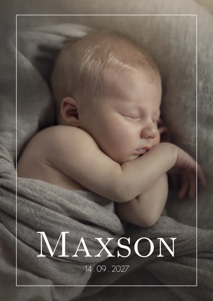 Prachtige fotokaart Maxson met een babyfoto van jouw kindje! Je kunt het kaartje helemaal zelf aanpassen naar jouw wensen. De naam is nu in goudfolie gezet maar deze kun je ook omzetten naar een andere kleur of koperfolie bijvoorbeeld. Let er wel op, de foto maakt de kaart! Dus maak een paar verschillende foto's en bekijk welke foto het mooiste uitkomt op de kaart. Wil je hulp bij het bewerken van je foto? Stuur ons een mailtje met de foto, dan passen we de foto voor je aan.