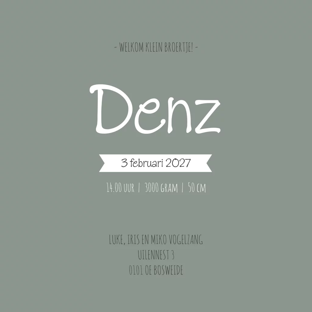 Een groen-grijs geboortekaartje met een silhouet illustratie van een grote broer met een klein broertje op de bakfiets. Kaartje Denz is geheel naar wens aan te passen zodat het past bij jouw gezinssituatie. Wil je het lichtsnoer liever verwijderen? Dat kun je gemakkelijk en snel doen in onze editor. Neem maar eens een kijkje in de editor naar alle mogelijkheden!