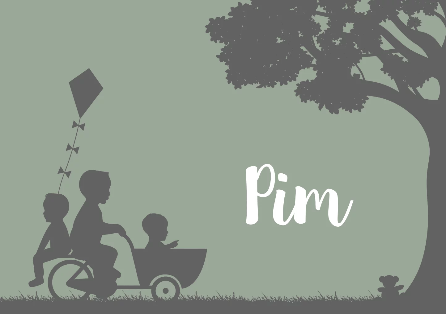 Een grijsgroen geboortekaartje met een illustratie van 3 broers op de bakfiets. Op het kaartje Pim zie je ook een grote boom en een klein knuffeltje. Een speels lettertype maakt het een vrolijk kaartje.