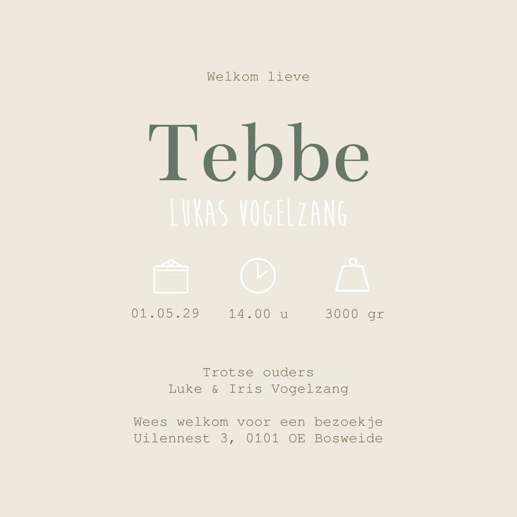Lief, zacht en neutraal beige/crème geboortekaartje met een teddybeertje die een ballon in zijn pootje houdt. Je kunt ook kiezen voor een beertje met een andere kleur ballon. Op geboortekaartje Tebbe kun je de illustratie aanpassen naar jouw wensen. In de beeldbank vind je veel mooie tekeningen waar je uit kunt kiezen. Wil je dit geboortekaartje liever in een ander kleur? Pas de kleur naar eigen wens aan in de editor.