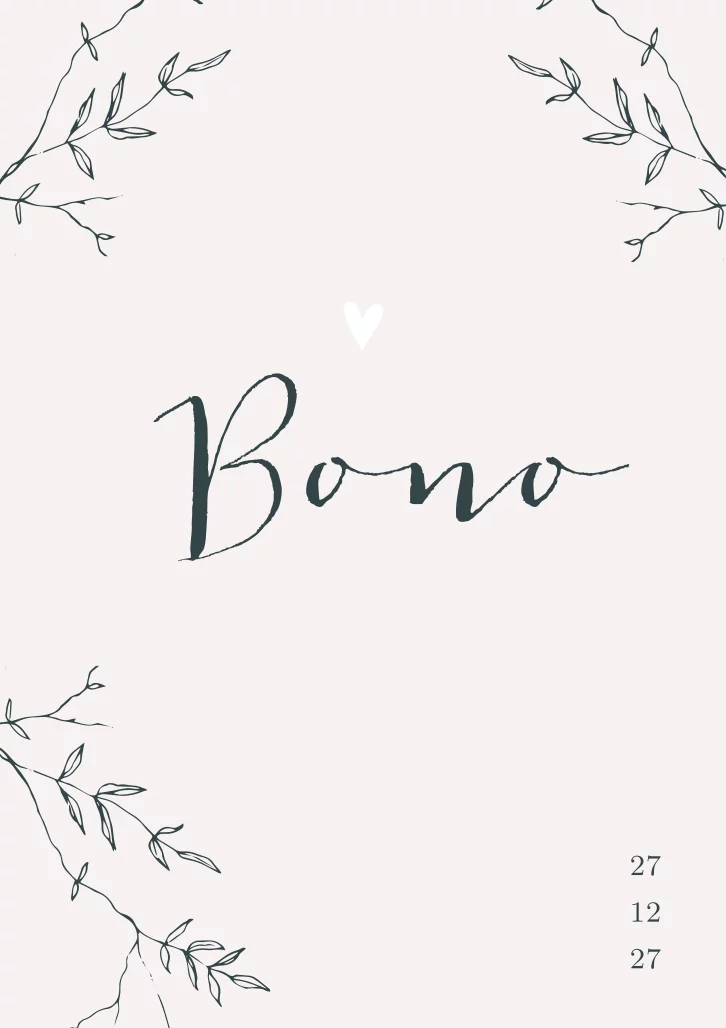 Modern beige / crème gewolkt geboortekaartje Bono voor een jongen met botanische takjes en sierlijke letters. Alle kleuren zijn aanpasbaar, zo ook de opmaak en de afbeeldingen.