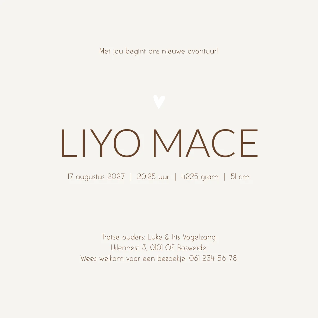 Bruin gewolkt geboortekaartje. Geboortekaartje Liyo is een stoer en warm geboortekaartje. Maak het kaartje extra bijzonder door het te laten bedrukken met goudfolie.