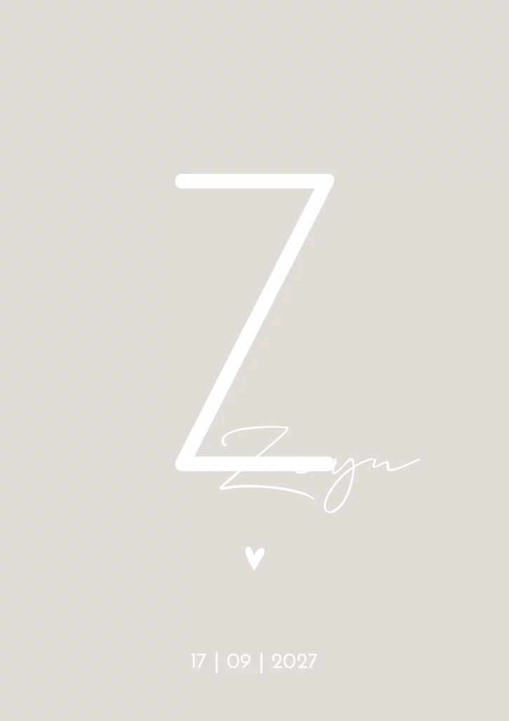 Een beige, neutraal geboortekaartje met een grote letter als initiaal op de kaart. Kaartje Zayn is een modern en strak geboortekaartje. Door de naam in goudfolie te drukken springt deze er extra uit!