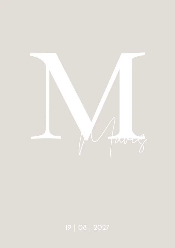 Een beige, neutraal geboortekaartje met een grote letter als initiaal op de kaart. Kaartje Mavis is een modern en strakke kaart. Door de naam in goudfolie te drukken springt deze er extra uit!