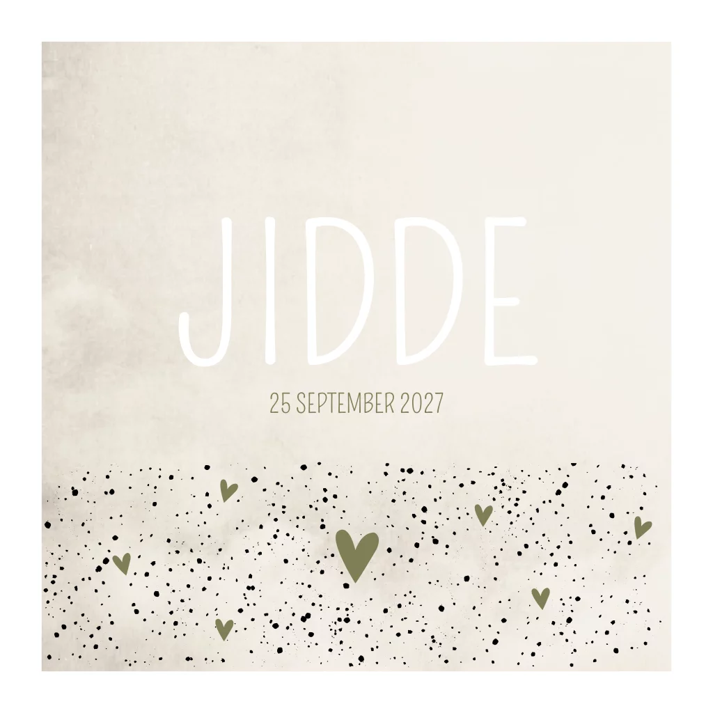 Beige / crème gewolkte geboorte kaart met zwarte stippen en legergroene hartjes. Geboortekaartje Jidde is ook mooi als je de hartjes laat bedrukken met koperfolie. Kijk in de editor en maak de kaart helemaal naar eigen smaak.