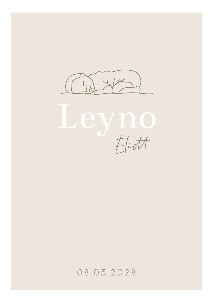 Een neutraal beige geboortekaartje met een wit kader en een lijntekening van een baby. Kaartje Leyno heeft een klassiek en tijdloos ontwerp.