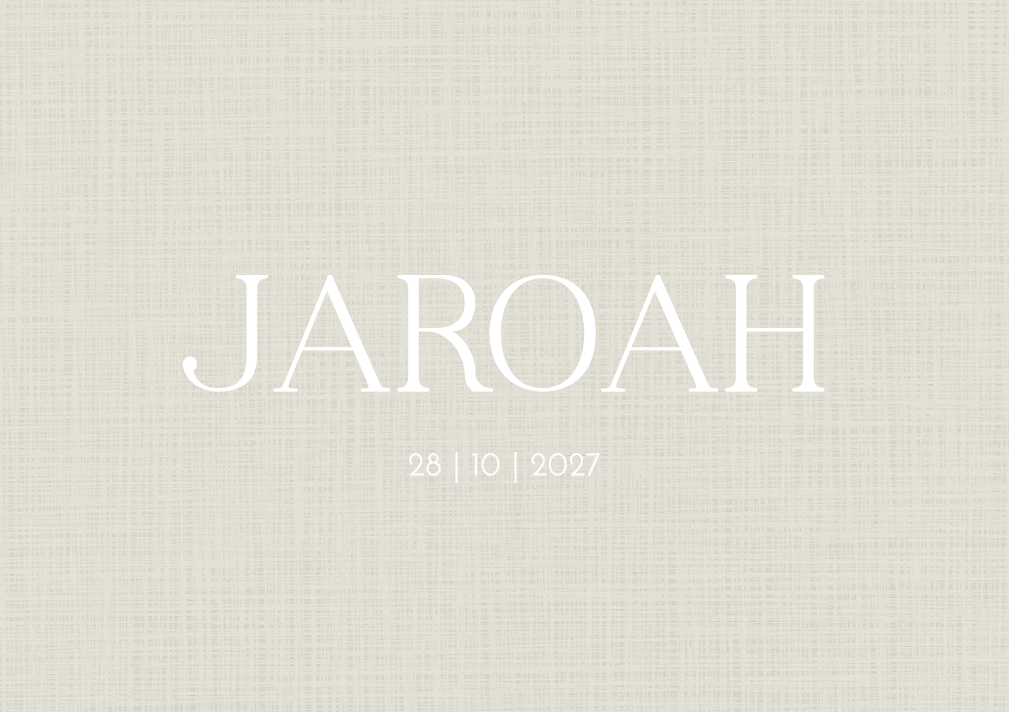 Prachtig stijlvol geboortekaartje met linnen achtergrond als afbeelding. Kaart Jaroah is erg mooi met de naam in goudfolie. Wil je de kaart toch liever net iets anders zodat het matches bij de babykamer van je kindje? Je kunt de kaart volledig zelf aanpassen in de editor!