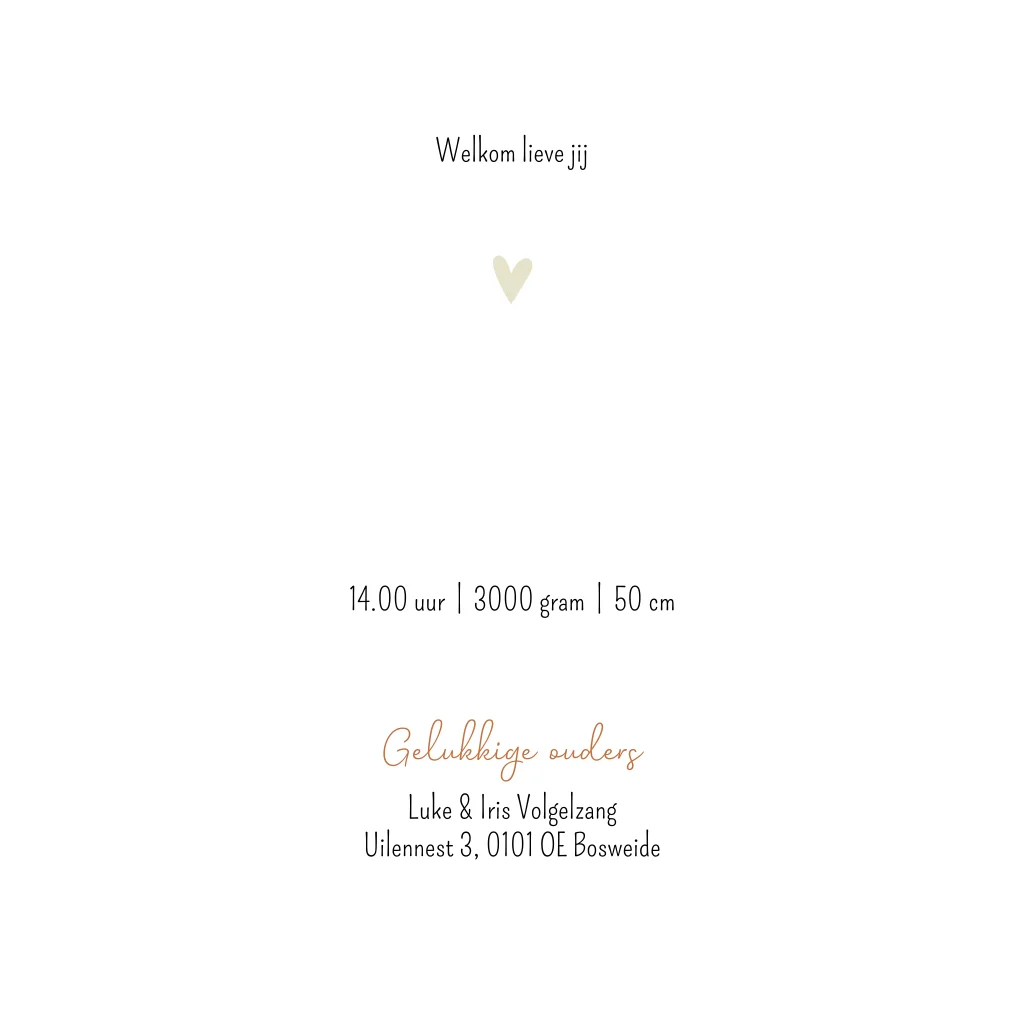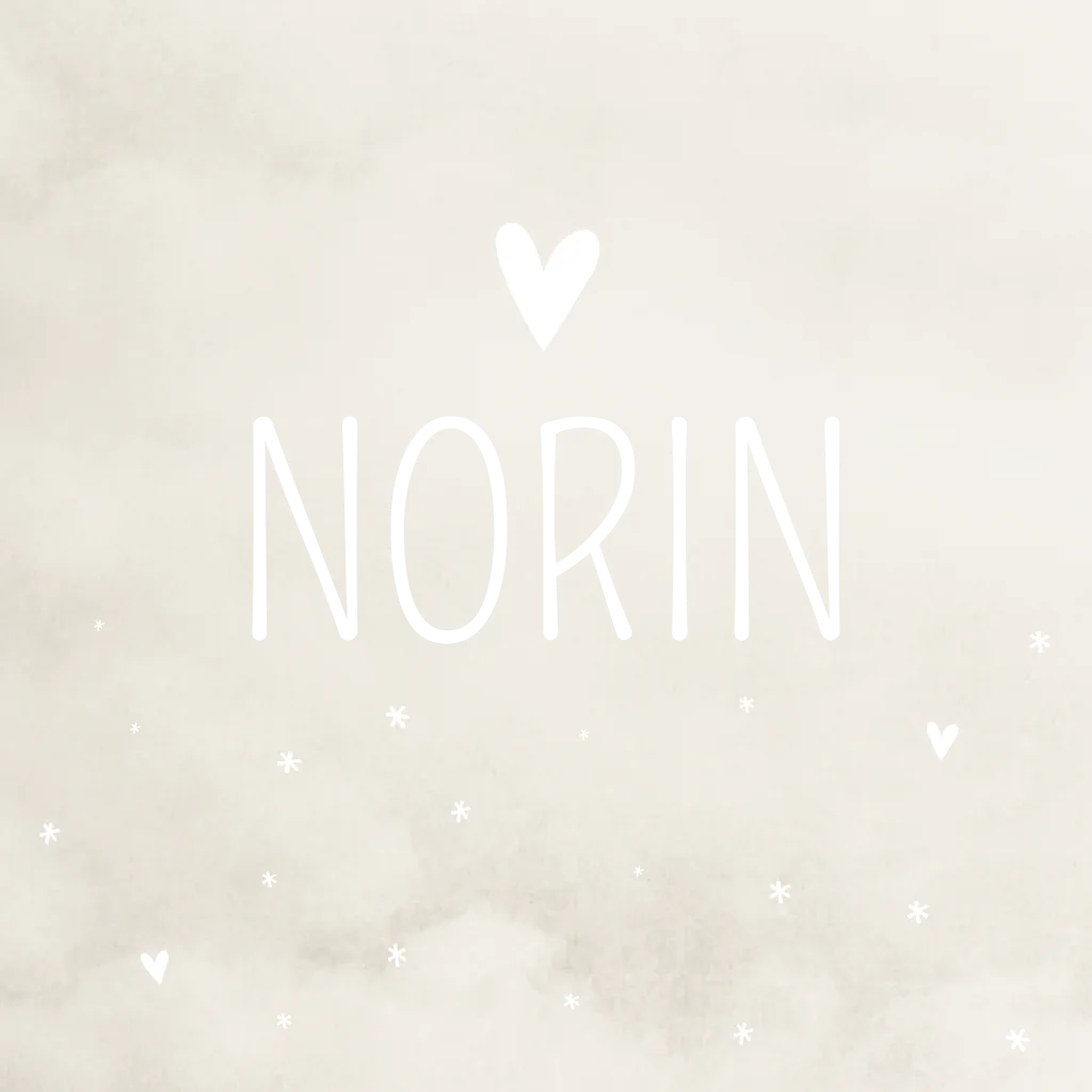 Neutraal beige/crème geboorte kaartje met witte hartjes en sterretjes en koper kleurige letters. Tip van de maker, laat geboortekaartje Norin bedrukken met koperfolie! Wil dit kaartje liever wat aangepast hebben? Kies dan voor een ander lettertype of vervang bijvoorbeeld het hartje voor een ander element of pas de achtergrondkleur aan. Heb je onze hulp nodig? Stuur ons dan een appje of mailtje.