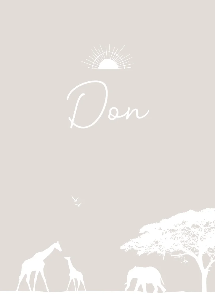 Een beige / crème geboortekaartje met wilde safari/savanne dieren uit Afrika. Op de kaart zie je giraffen, een olifant, vogels een een opgaande/ondergaande zon. Kaartje Don is voor alle natuurliefhebbers! Wil je liever andere dieren op de kaart? Neem dan een kijkje in onze editor voor alle mogelijkheden.