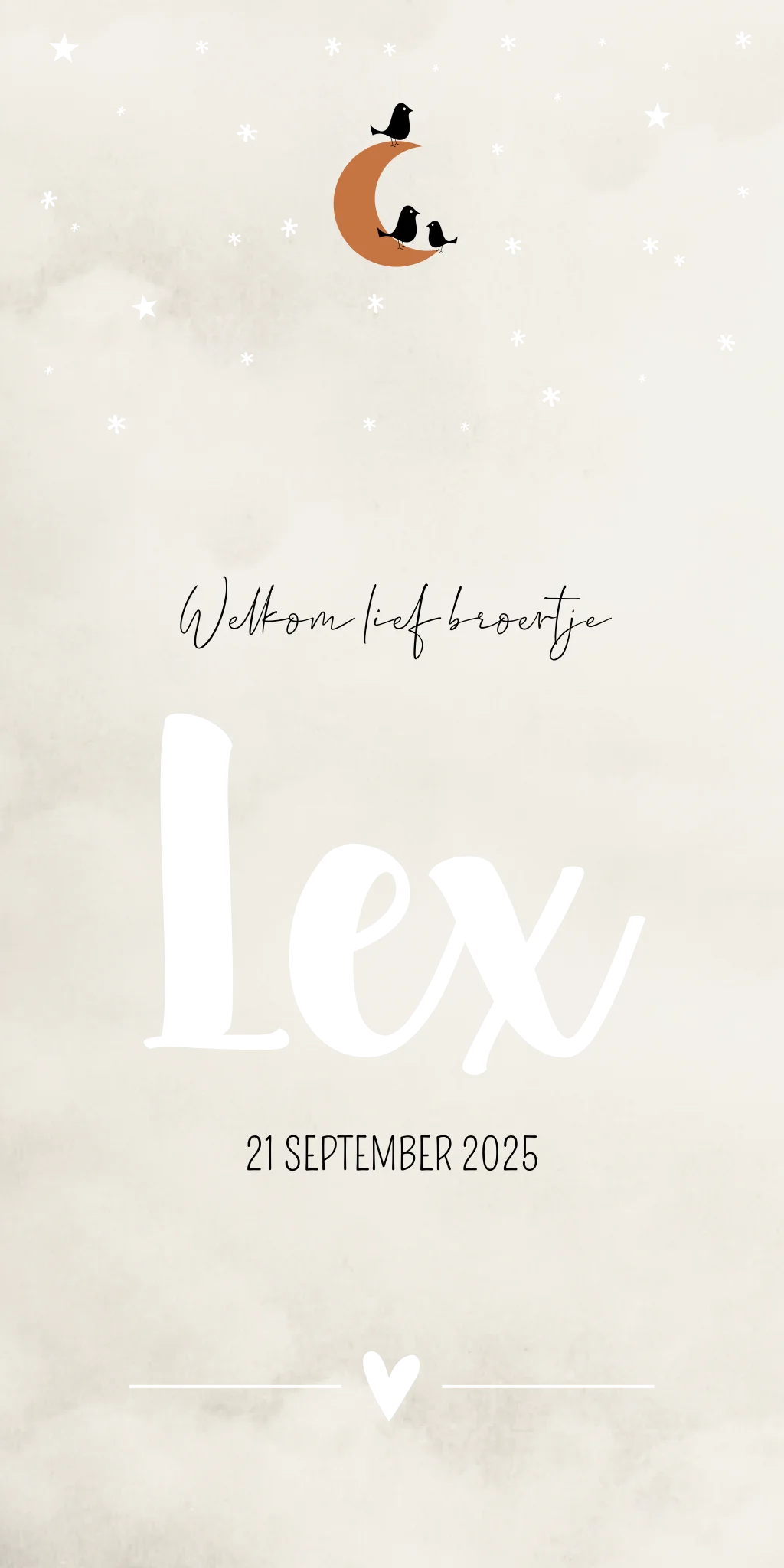 Een gewolkt beige geboortekaartje met koperen sterretjes en naam. Bij het kaartje Lex staan 3 vogeltjes op de maan, symbool voor papa, mama en kindje of 3 broertjes/zusjes. Wil je kaartje Lex aanpassen naar jouw wensen? Pas het kaartje dan gemakkelijk zelf aan in onze editor!