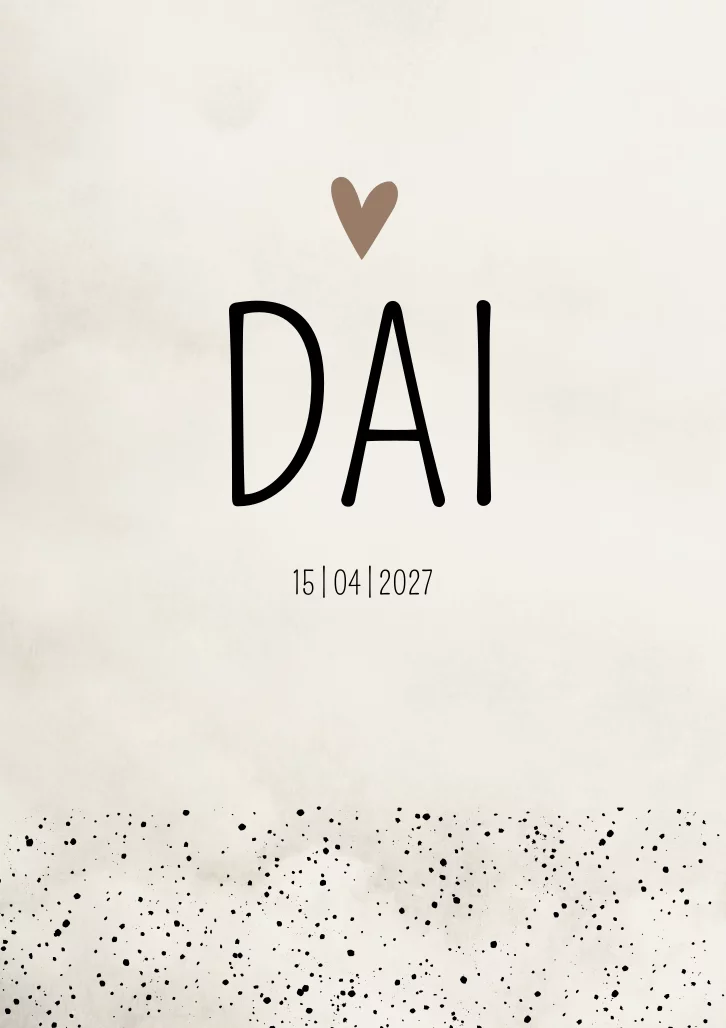 Een beige gewolkt geboortekaartje met stipjes, hartjes en zwarte letters. Kaartje Dai Luke is stoer en neutraal. Wil je graag iets aanpassen? Neem dan een kijkje in onze editor voor alle opties.