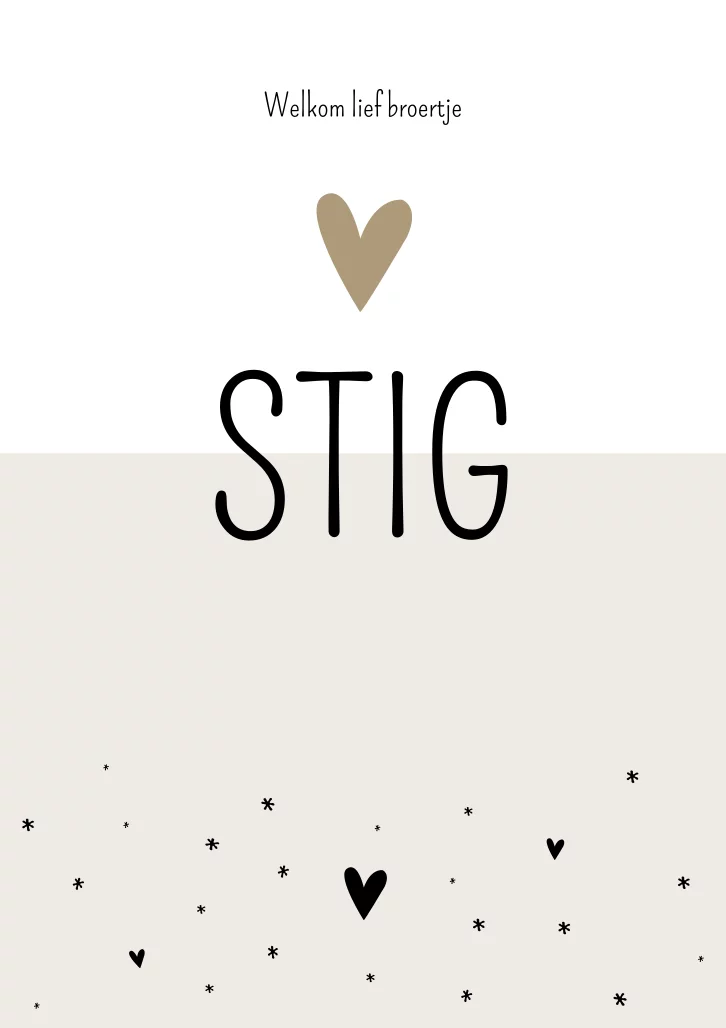 Een neutraal beige geboortekaartje met zwarte hartjes en sterretjes en bruine details als afwerking. Geboortekaartje Stig is een strak kaartje. Tip! Maak het kaartje extra leuk door een label toe te voegen en deze te bevestigen door middel van een paperclip.