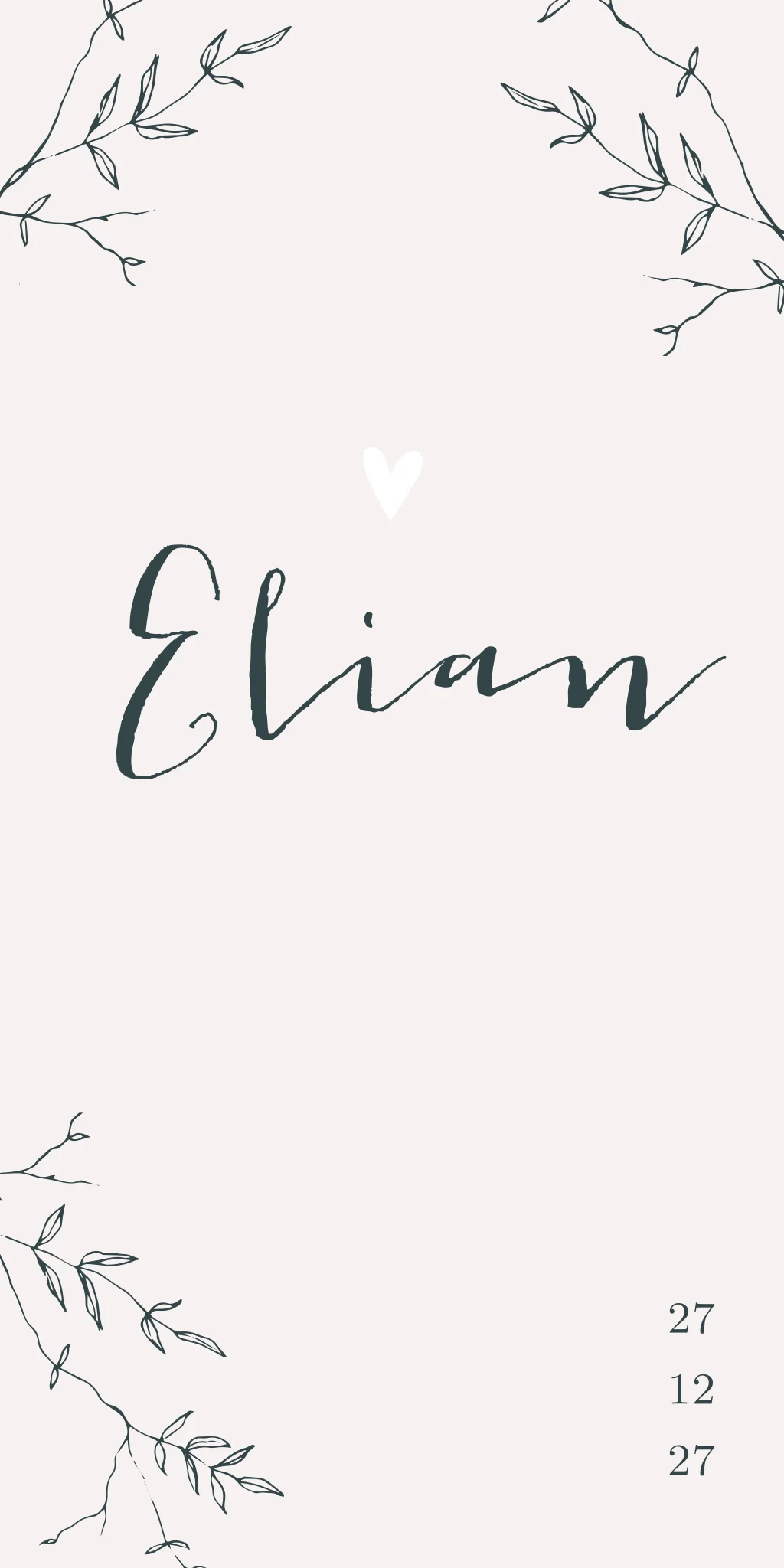 Modern beige / crème gewolkt geboortekaartje Elian voor een jongen met botanische takjes en sierlijke letters. Alle kleuren zijn aanpasbaar, zo ook de opmaak en de afbeeldingen.