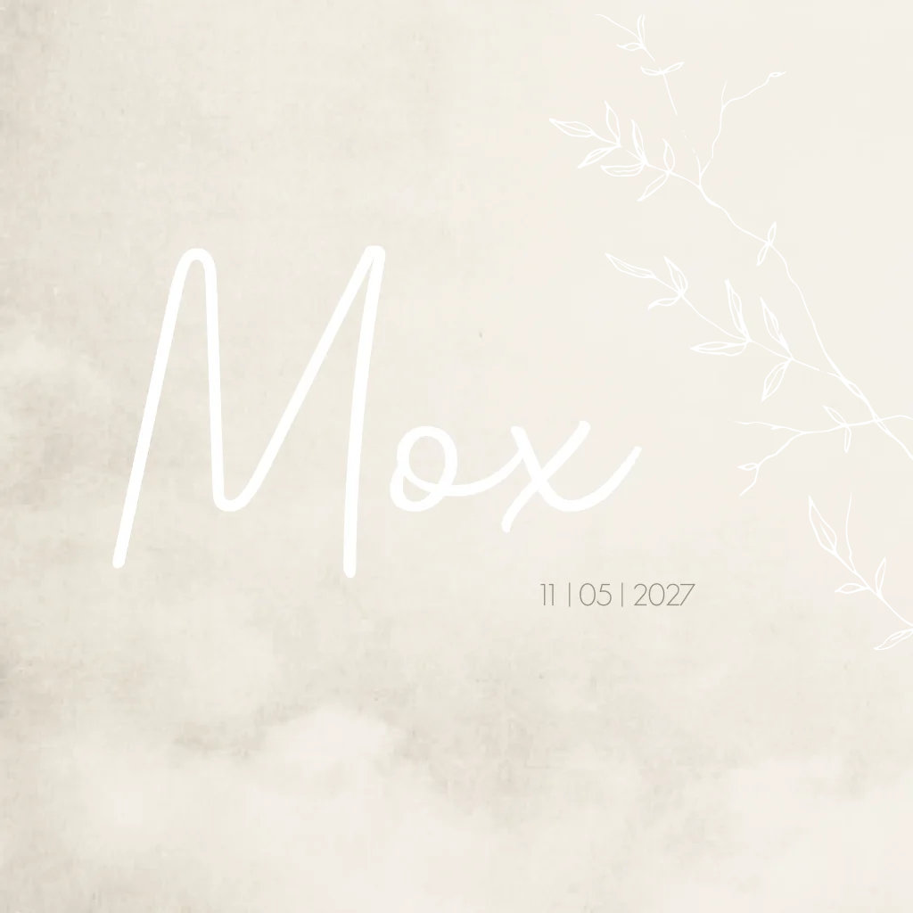 Modern beige/ crème gewolkt geboortekaartje Mox met botanische goudkleurige takjes, sierlijke witte letters en een witte binnenzijde met taupe kleurige letters en de naam in goudfolie. Alle kleuren zijn aanpasbaar, zo ook de opmaak en de afbeeldingen.