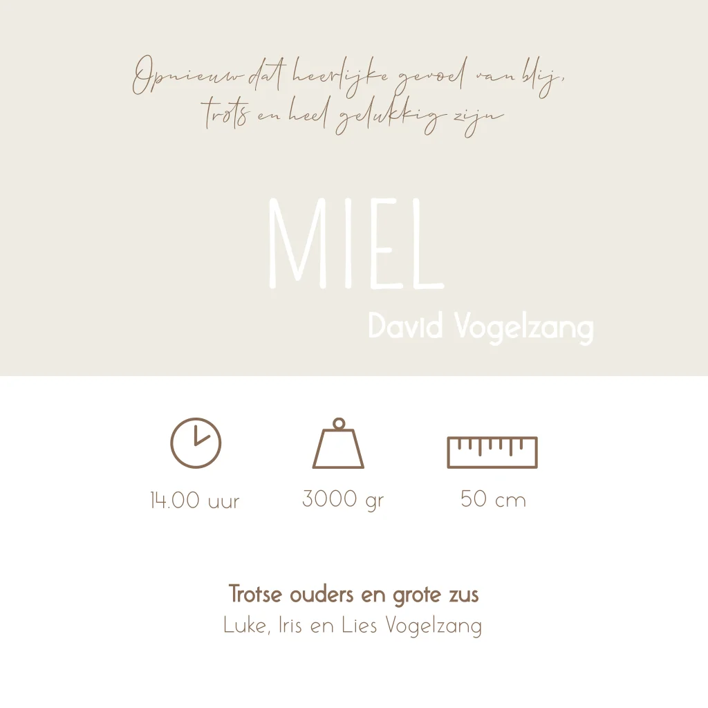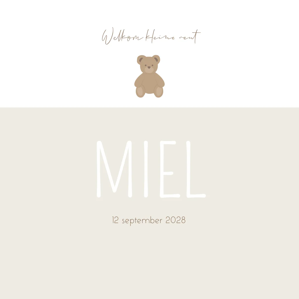 Een beige crème geboorte kaartje Miel met teddy beertje en witte letters voor de naam. Aan de binnenkant staat een lijntekening van een grote zus die haar broertje omarmt en een kusje geeft. Pas dit geboortekaartje naar eigen wens aan in de editor.