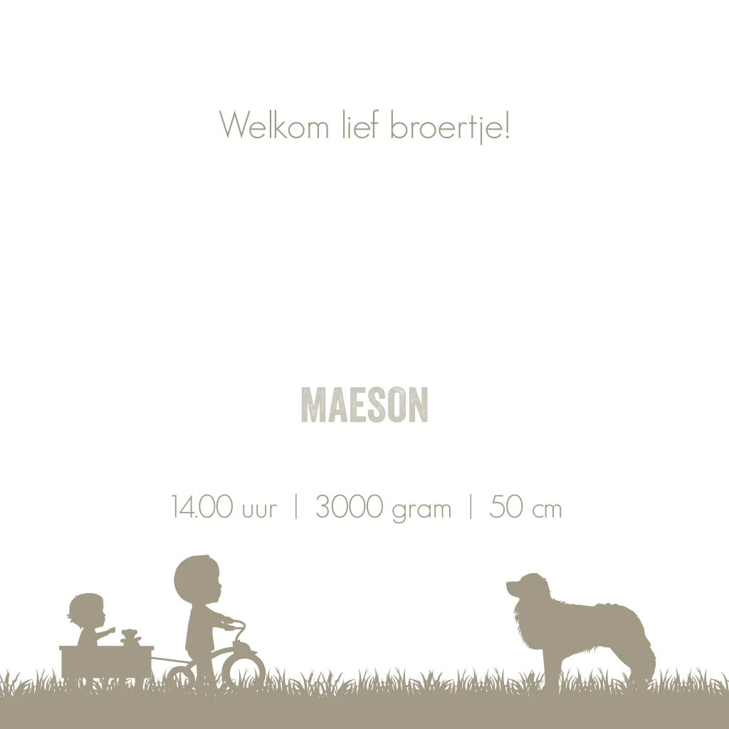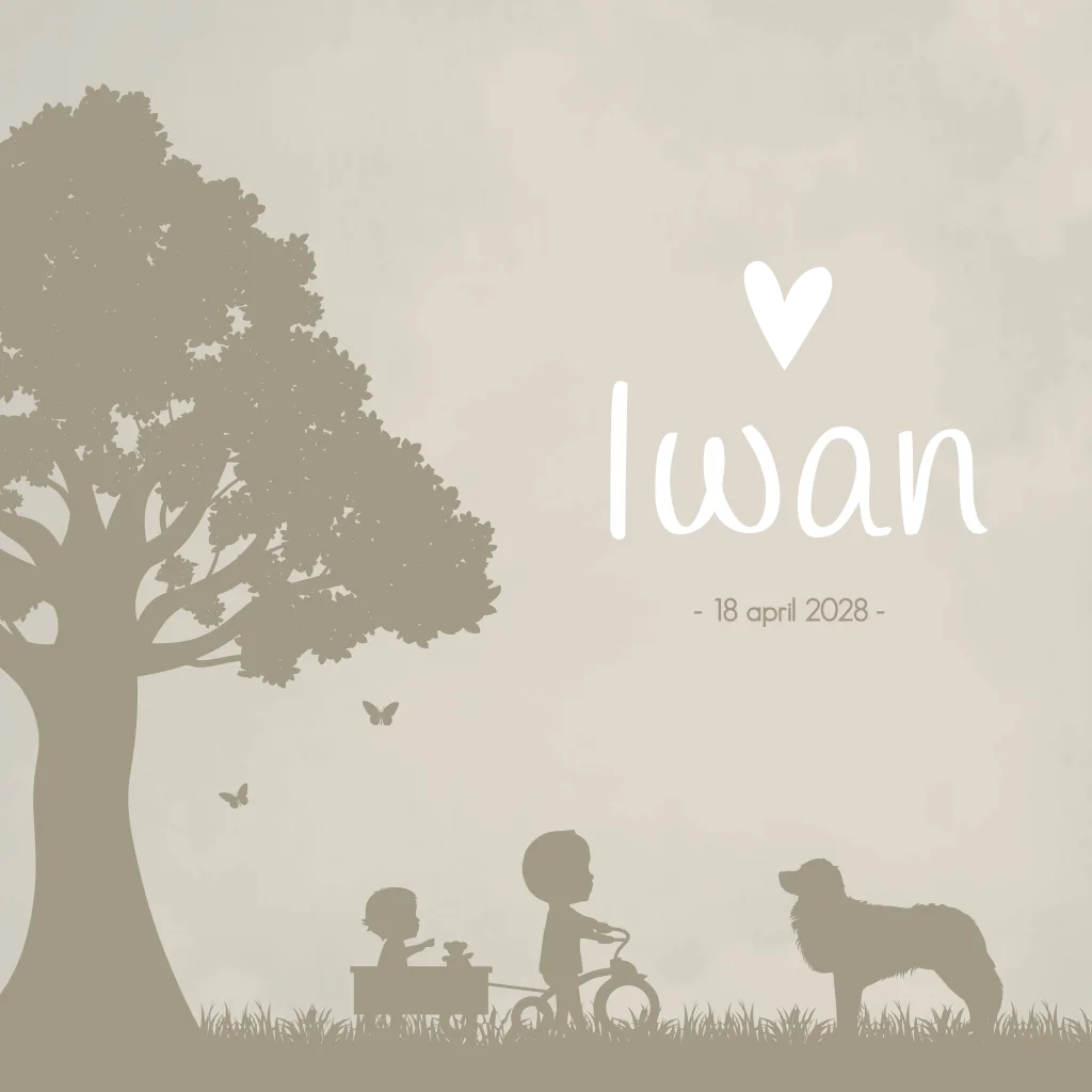 Een stoer geboortekaartje met een beige/crème gewolkte achtergrond. Op het kaartje Iwan staat een illustratie van een grote broer met zijn kleine broertje en hond. Wil je liever een andere illustratie? Pas het kaartje dan gemakkelijk zelf aan in onze editor.