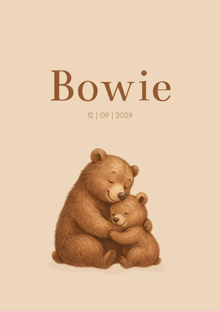 Een schattig beige geboortekaartje waarop twee beren broertjes elkaar een knuffel geven. De kleuren op kaartje Bowie pas je gemakkelijk aan in de editor.