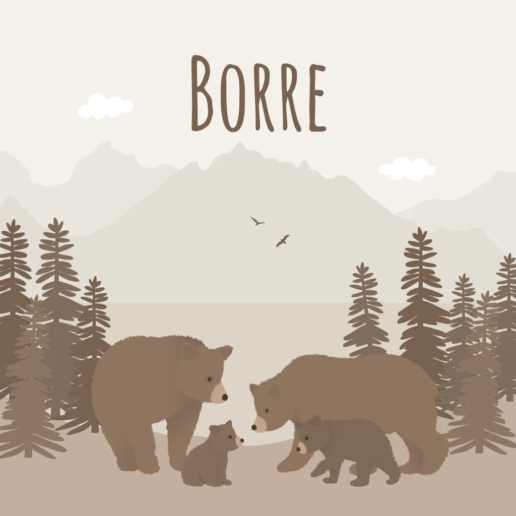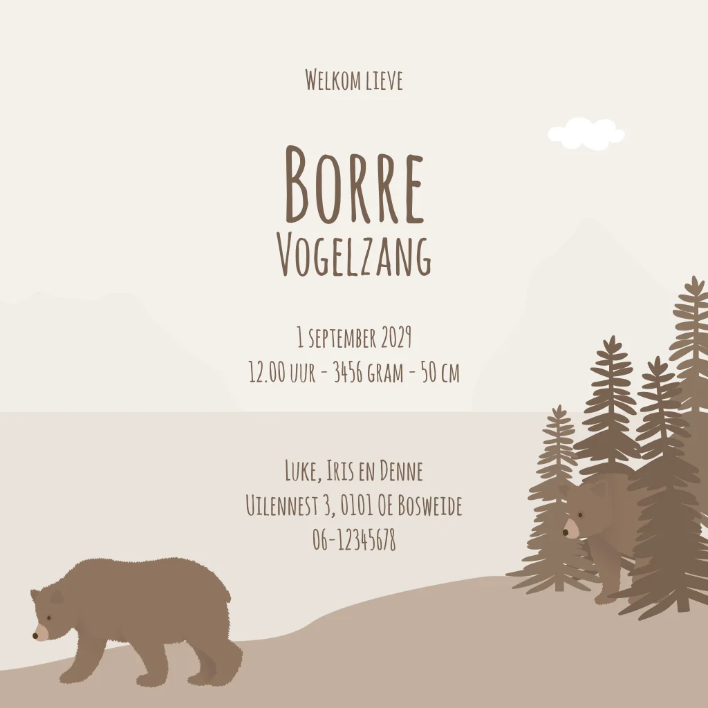 Een stoer geboortekaartje met daarop een beren familie in de bergen. Geboortekaartje Borre is volledig naar wens aan te passen in de editor.