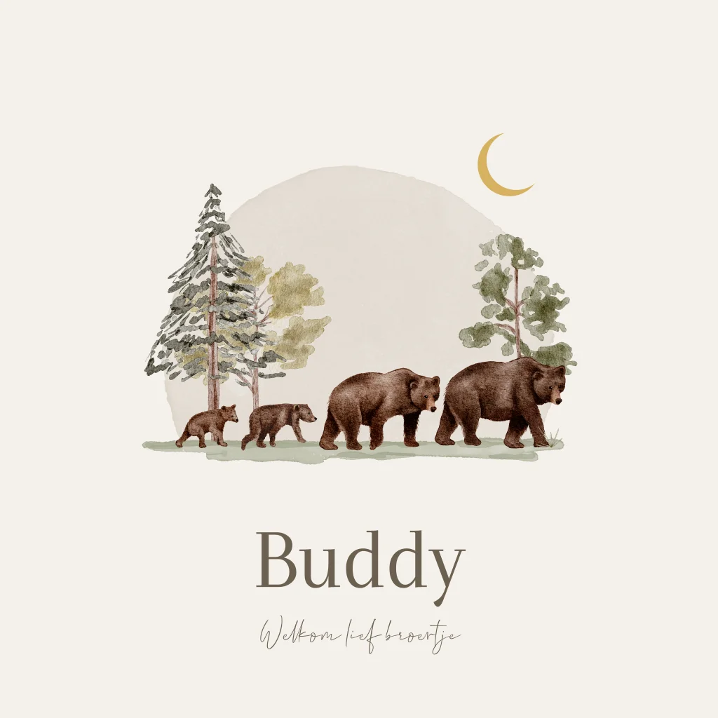Een herfstig kaartje met een berenfamilie in het bos. Op kaartje Buddy zie je twee grote beren met twee kleine beertjes omringd door verschillende bomen in waterverf stijl. Wil je graag de diertjes vervangen of verplaatsen? Neem dan een kijkje in onze editor voor de vele opties!