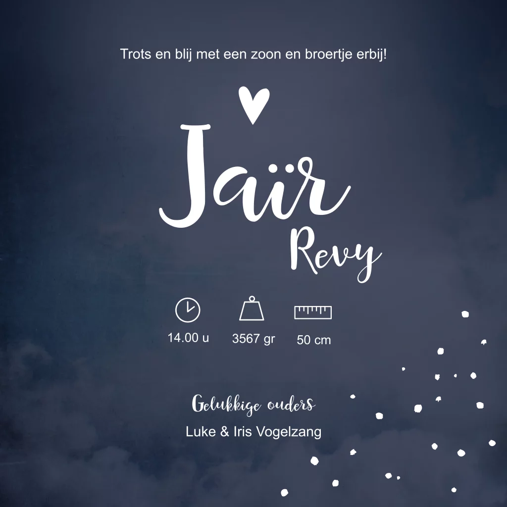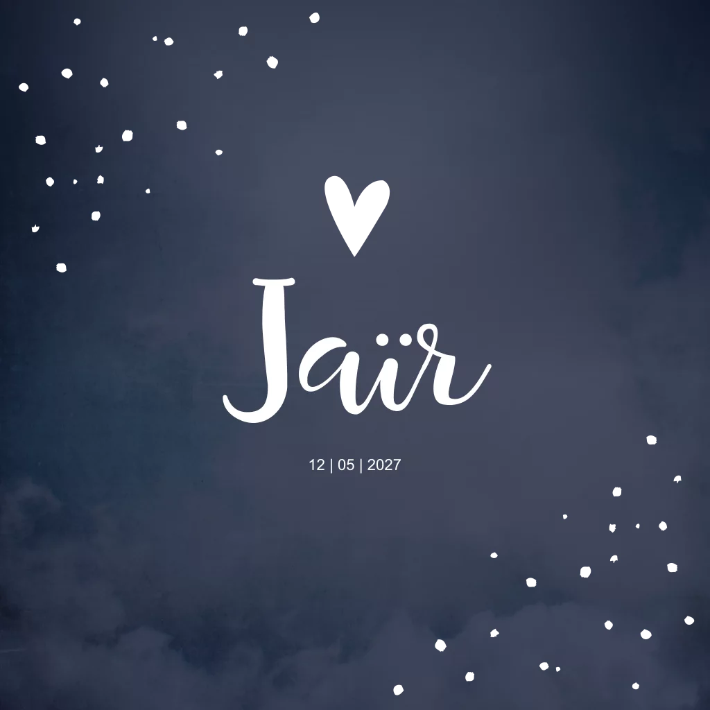 Stoere donkerblauwe geboorte kaart met hartje en stipjes. Laat de gouden elementen van geboortekaartje Jaïr bedrukken in goudlook of met goudfolie. Pas de teksten eenvoudig aan in de editor.