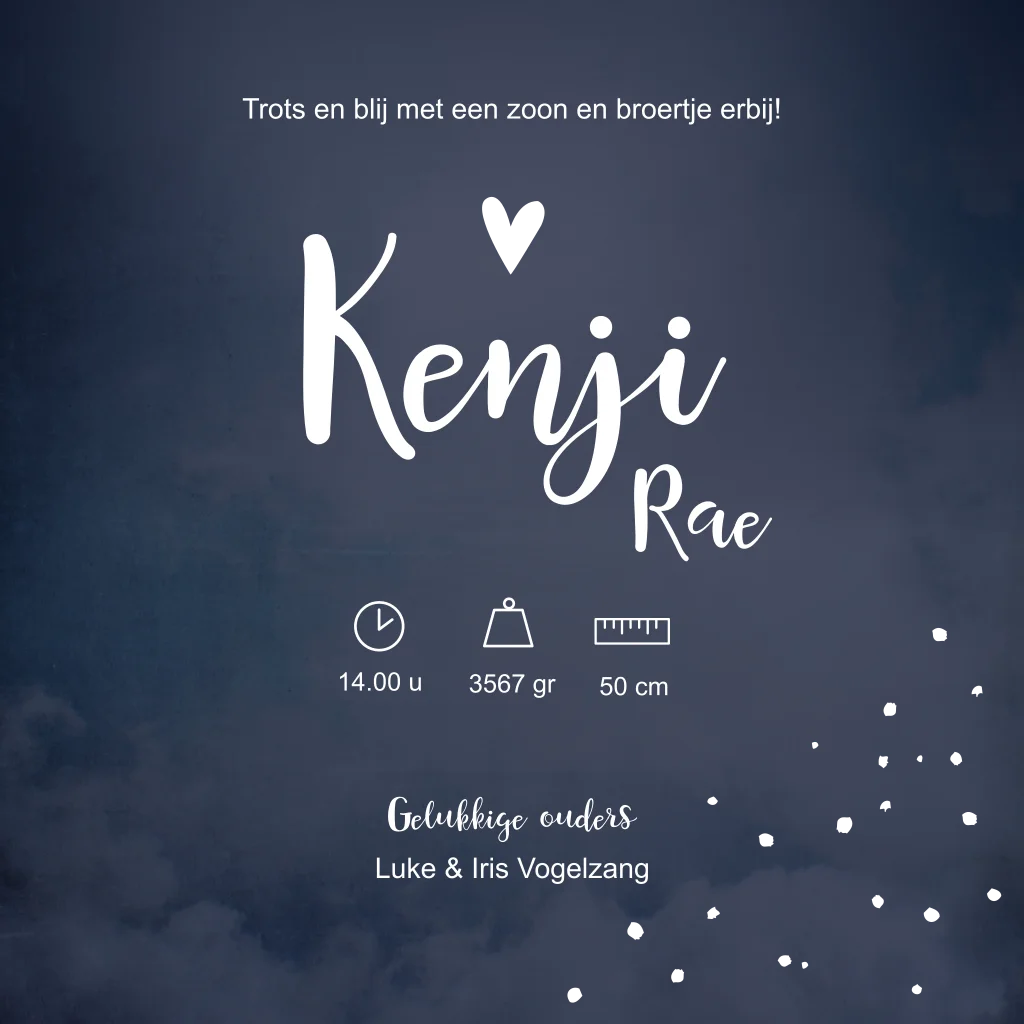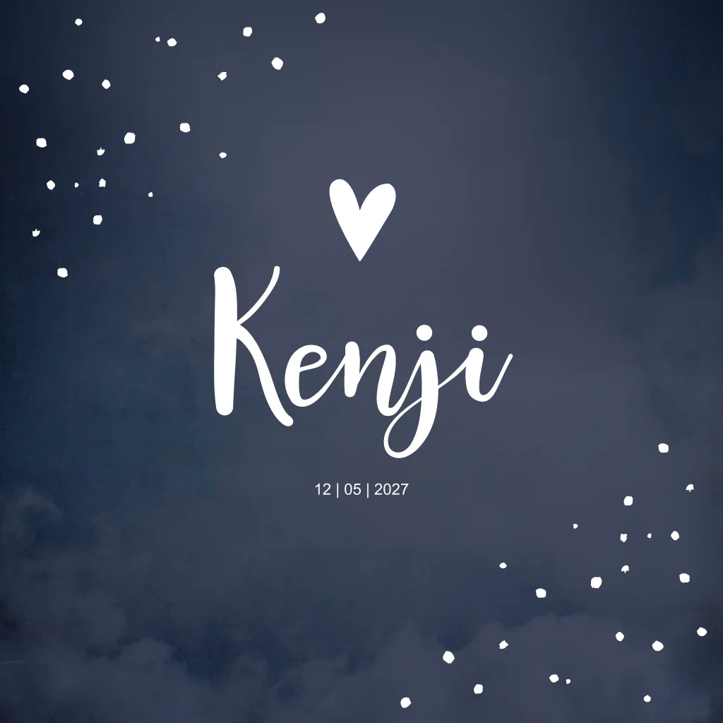 Donkerblauw geboortekaartje met hartje en stipjes. Geboortekaartje Kenji is ontzettend mooi wanneer je het laat bedrukken met koperfolie. Wil je dit geboortekaartje liever in een ander kleur of lettertype? Je past het kaartje eenvoudig aan in de editor.