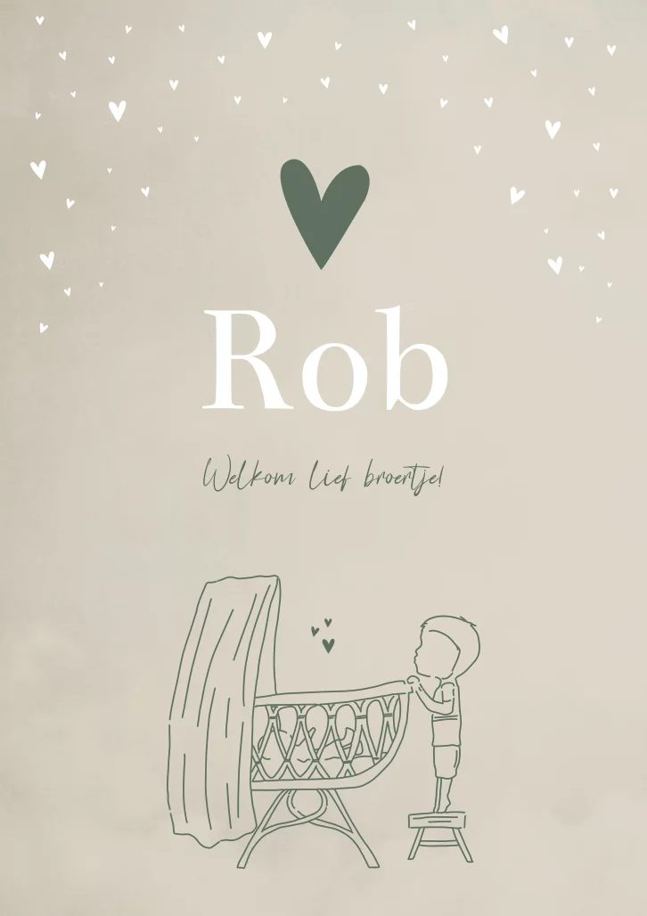 Een romantisch beige/creme geboortekaartje met een lijntekening van een grote broer die in het wiegje kijkt in groene kleur. Wil je kaartje Rob graag aanpassen zodat het past bij jullie gezinssituatie? Neem dan een kijkje in onze editor voor alle opties.