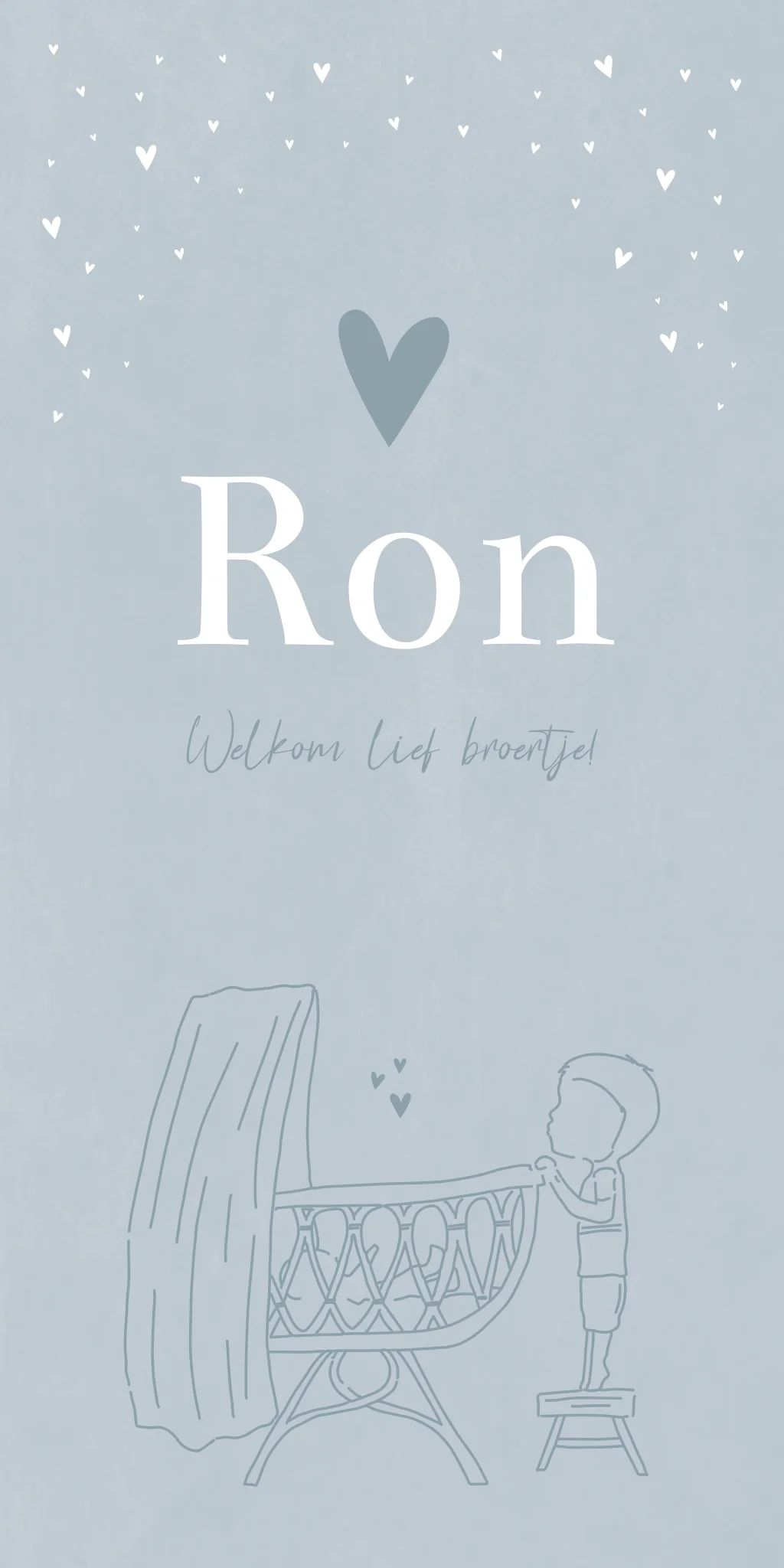 Een romantisch lichtblauw geboortekaartje met een lijntekening van een grote broer die in het wiegje kijkt. Wil je kaartje Ron graag aanpassen zodat het past bij jullie gezinssituatie? Neem dan een kijkje in onze editor voor alle opties.