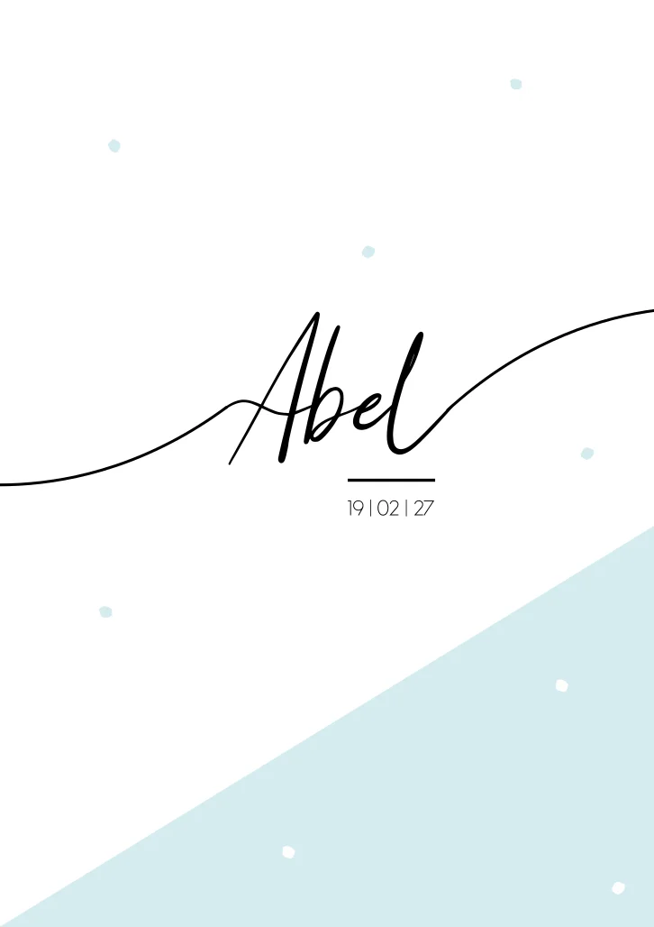 Een wit geboortekaartje met een blauw vlak. Op kaartje Abel staan verschillende kleine stipjes en staat de naam op een sierlijke manier op de kaart.