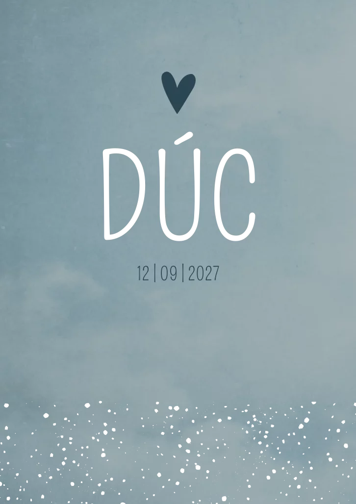 Een lichtblauw gewolkt geboortekaartje met goudfolie voor de naam en stipjes.