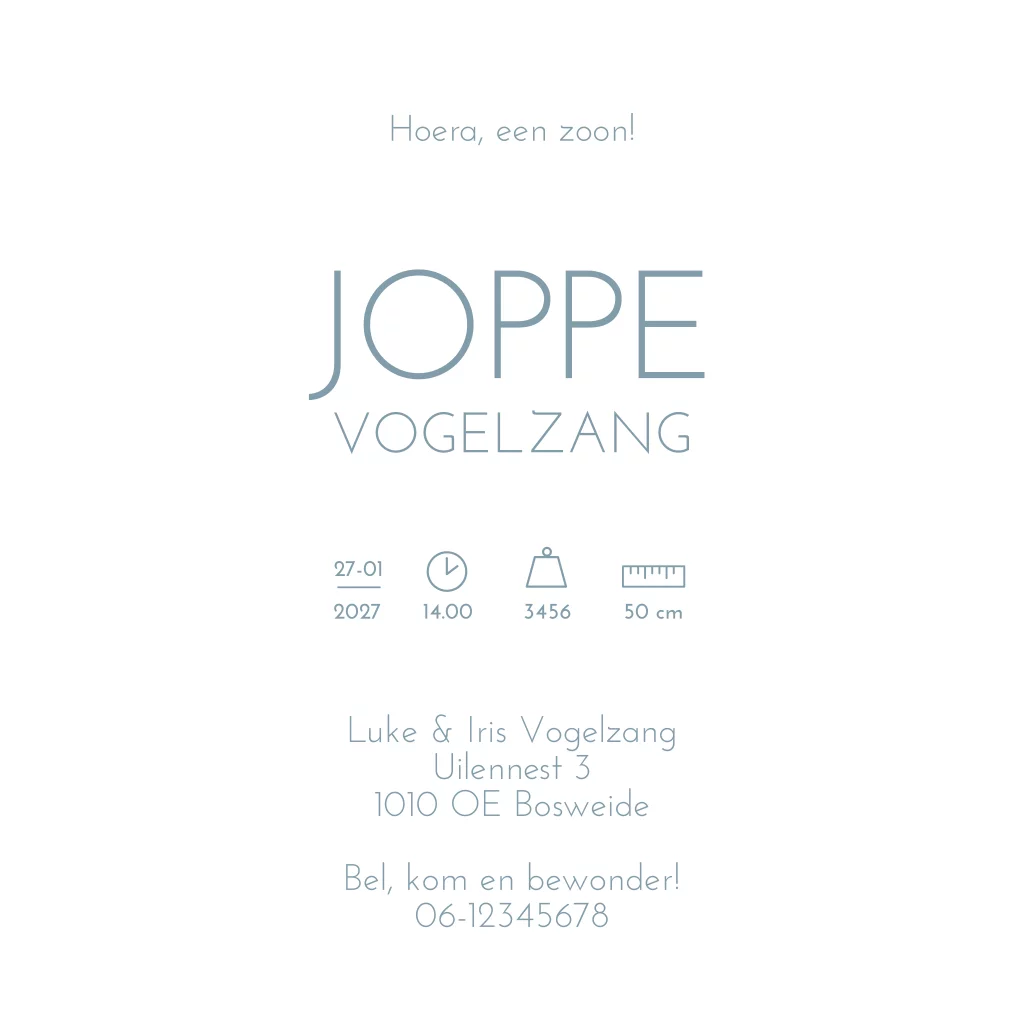 Blauw geboortekaartje met papa, mama en zoon op een trekker. Geboortekaartje Joppe is een illustratiekaart waarbij je de illustraties zelf kunt aanpassen naar jouw gezinssamenstelling. Kom je er niet uit? Neem dan gerust contact met ons op!