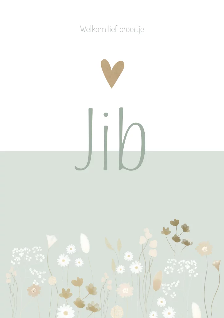Lief, mint groen geboorte kaartje voor een jongen met veel droogbloemen/ een bloemenveld in lichte beige neutrale kleuren. Het licht bruine hartje geeft kaartje Jib net een beetje contrast. Zie jij het kaartje liever anders voor je? Je kunt het helemaal zelf samenstellen in onze editor!