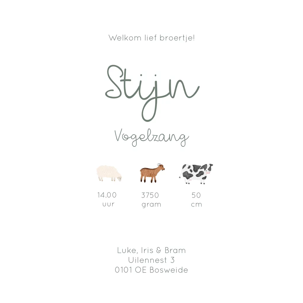 Een vrolijk geboortekaartje met kleine illustraties van diertjes zoals een schaap, varken, koe, geit, gans, kip, haan, bij en kuikens. Ook zie je illustraties die horen bij het boerderij/platteland leven zoals een trekker/tractor en groente, bloemen en natuur. Kaartje Stijn is daarom perfect voor de dierenliefhebbers en de boeren onder ons! Wil je graag iets aanpassen? Neem dan een kijkje in onze editor voor alle opties.