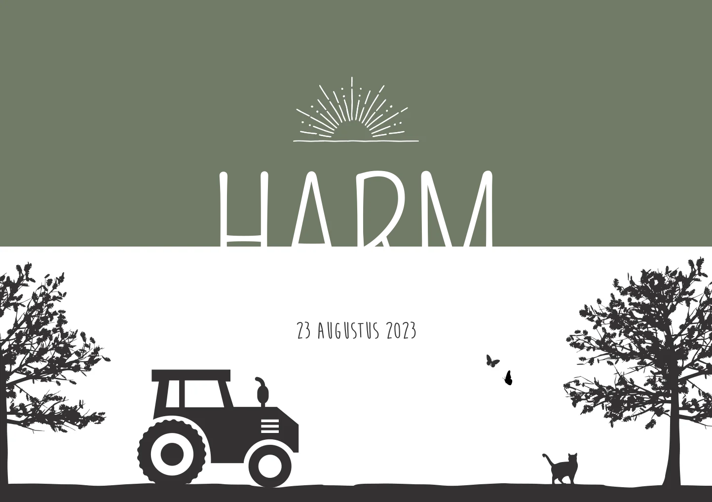 Illustratief groen wit babykaartje Harm voor een jongen met stoere tractor, illustraties van bomen en 2 katten in antraciet grijze kleur. Je maakt de kaart helemaal eigen door illustraties toe te voegen of te verwijderen. Ook kun je illustraties van kindjes toevoegen aan deze kaart.