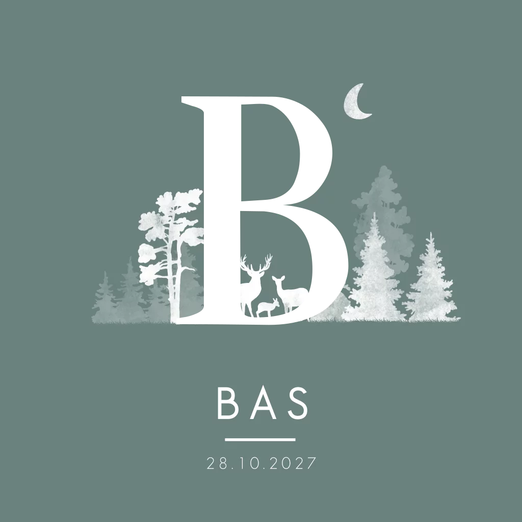 Een perfect kaartje voor de natuurliefhebbers. Kaartje Bas is een letterkaartje met een gouden initiaal op de kaart verwerkt. Rondom de letter staat een herten familie in waterverf-stijl.
