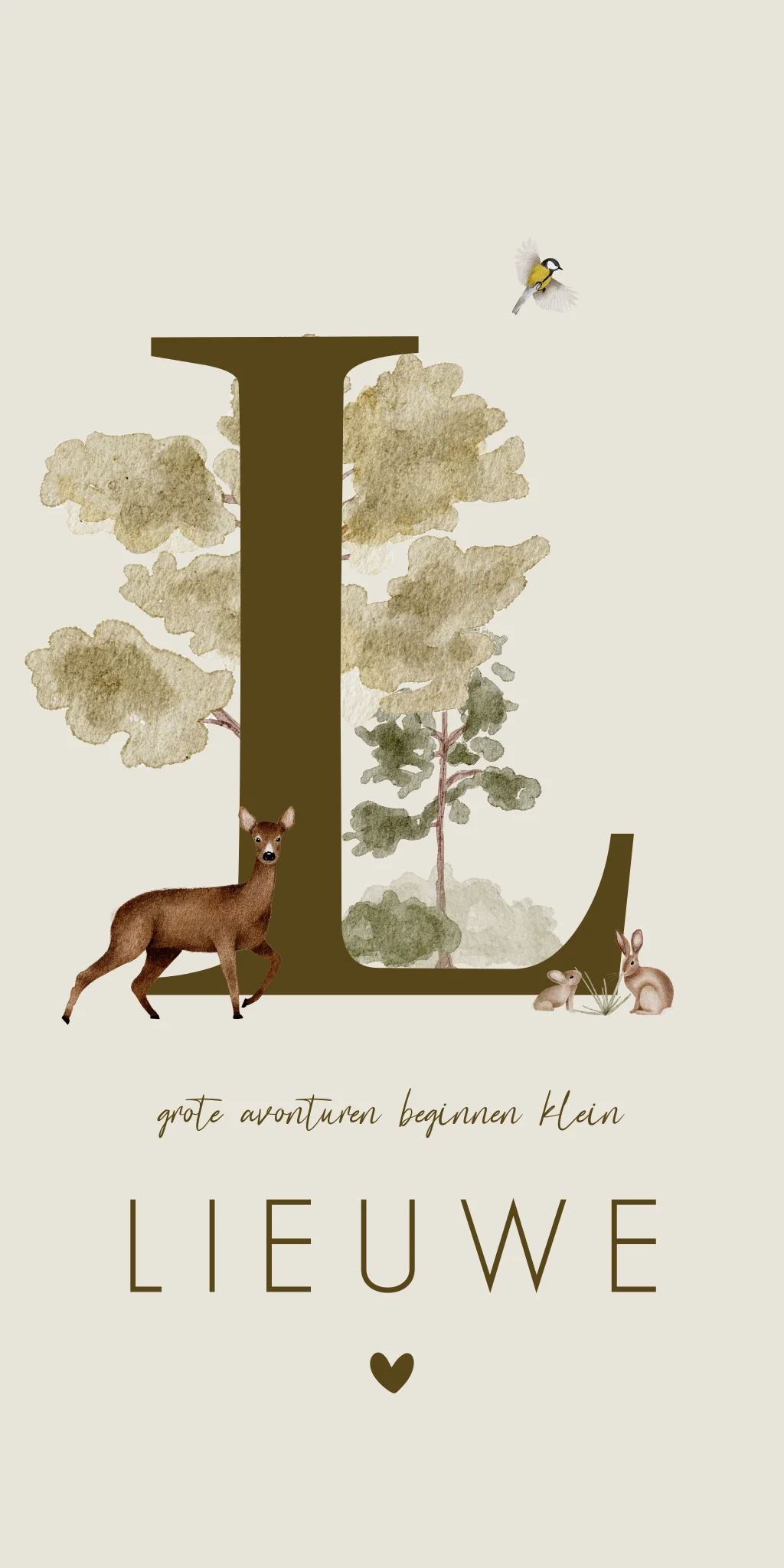 Een naturel beige kleurig letterkaartje met waterverf bosdieren. Op het kaartje staan een hertje, konijntjes en een vogeltje. Wil je graag andere diertjes op de kaart? Neem dan een kijkje in onze editor voor alle opties. Tip! Gebobbeld papier is voor kaartje Lieuwe extra mooi, zo lijkt het kaartje écht geschilderd.