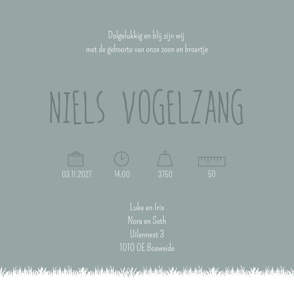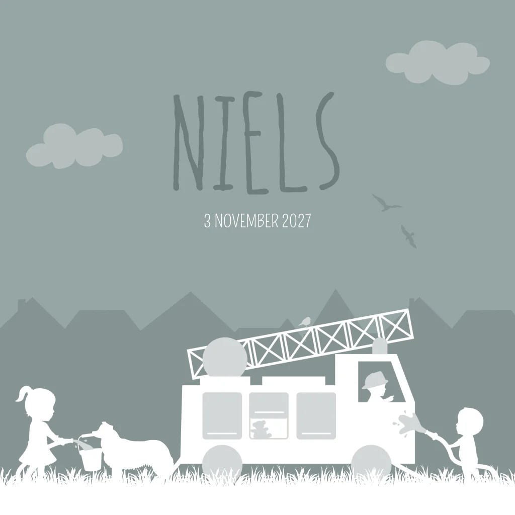 Een stoer grijs/groen geboortekaartje met een illustratie van kindjes in en om een brandweerwagen. Kaartje Niels is een stoer en speels geboortekaartje door de verschillende illustraties. Wil je graag de gezinssamenstelling aanpassen op de voorzijde? Doe ons dan even een berichtje, dan helpen we je graag verder.