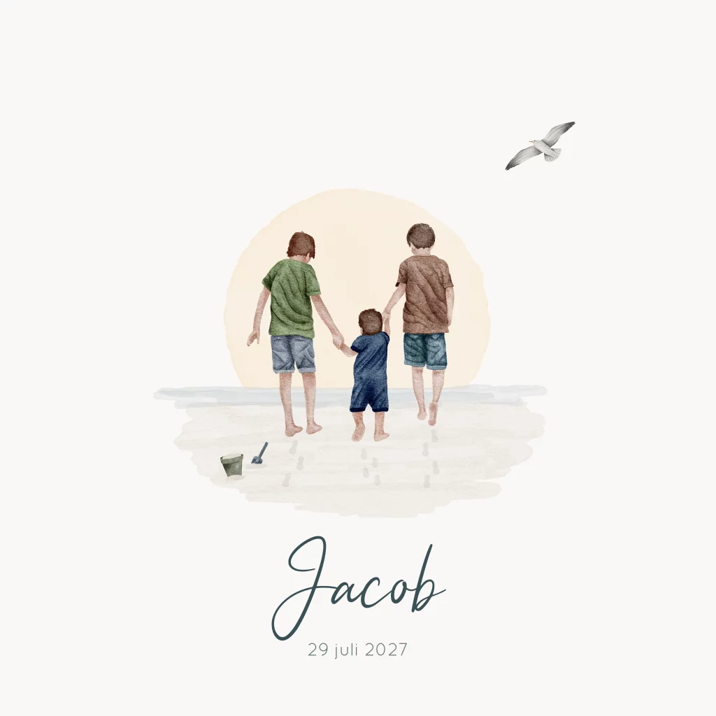 Een waterverf geboortekaartje met een zee-thema. Op geboortekaartje Jacob zie je drie broers die elkaars hand vast houden. Ze lopen naar de zee. Verder zie je op kaartje Jacob een meeuw, speelgoed en een 'ondergaande/opgaande zon'. Wil je graag iets aanpassen aan het kaartje? Neem dan een kijkje in onze editor voor de vele opties!