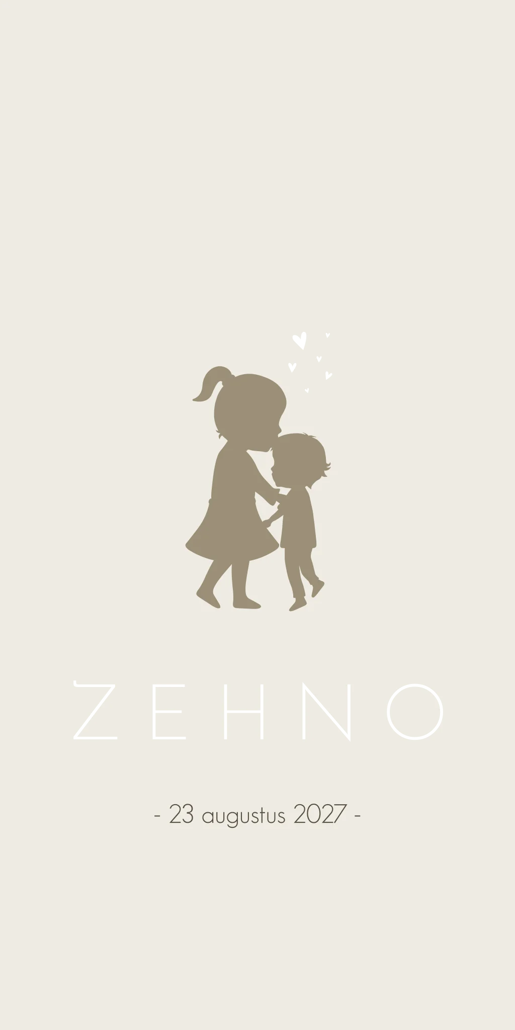 Super strak beige/ crème geboortekaartje Zehno met een silhouet tekening van een zus die haar kleine broertje een kusje geeft. Omdat ze zoveel van haar kleine broertje houdt vliegen de vonken in hartjes vorm er vanaf!