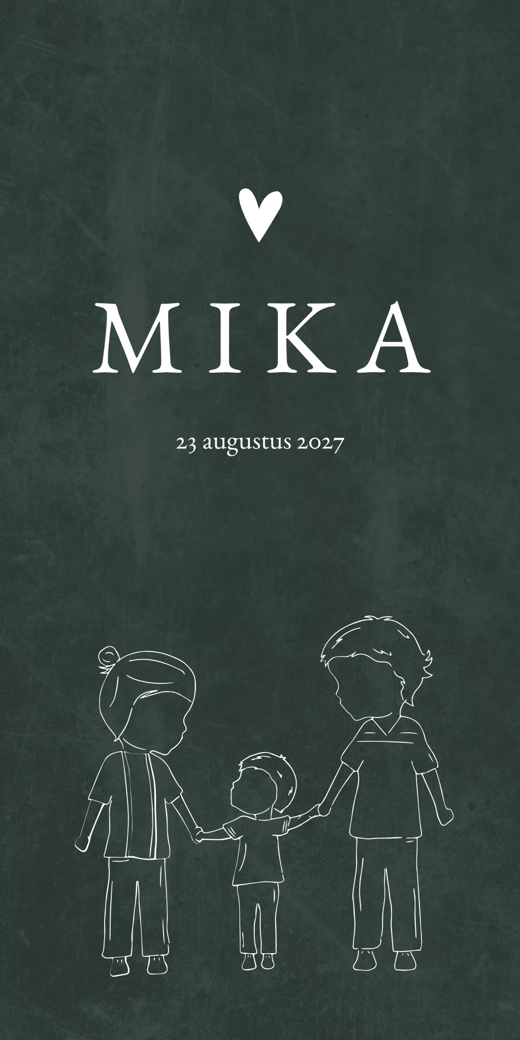 Een stoer donkergroen geboortekaartje met een lijntekening van 2 broertjes en een zusje. Kaartje Mika is een simplistisch maar lief kaartje. Heb je een andere gezinssituatie? Pas de illustratie dan gemakkelijk zelf aan in onze editor.