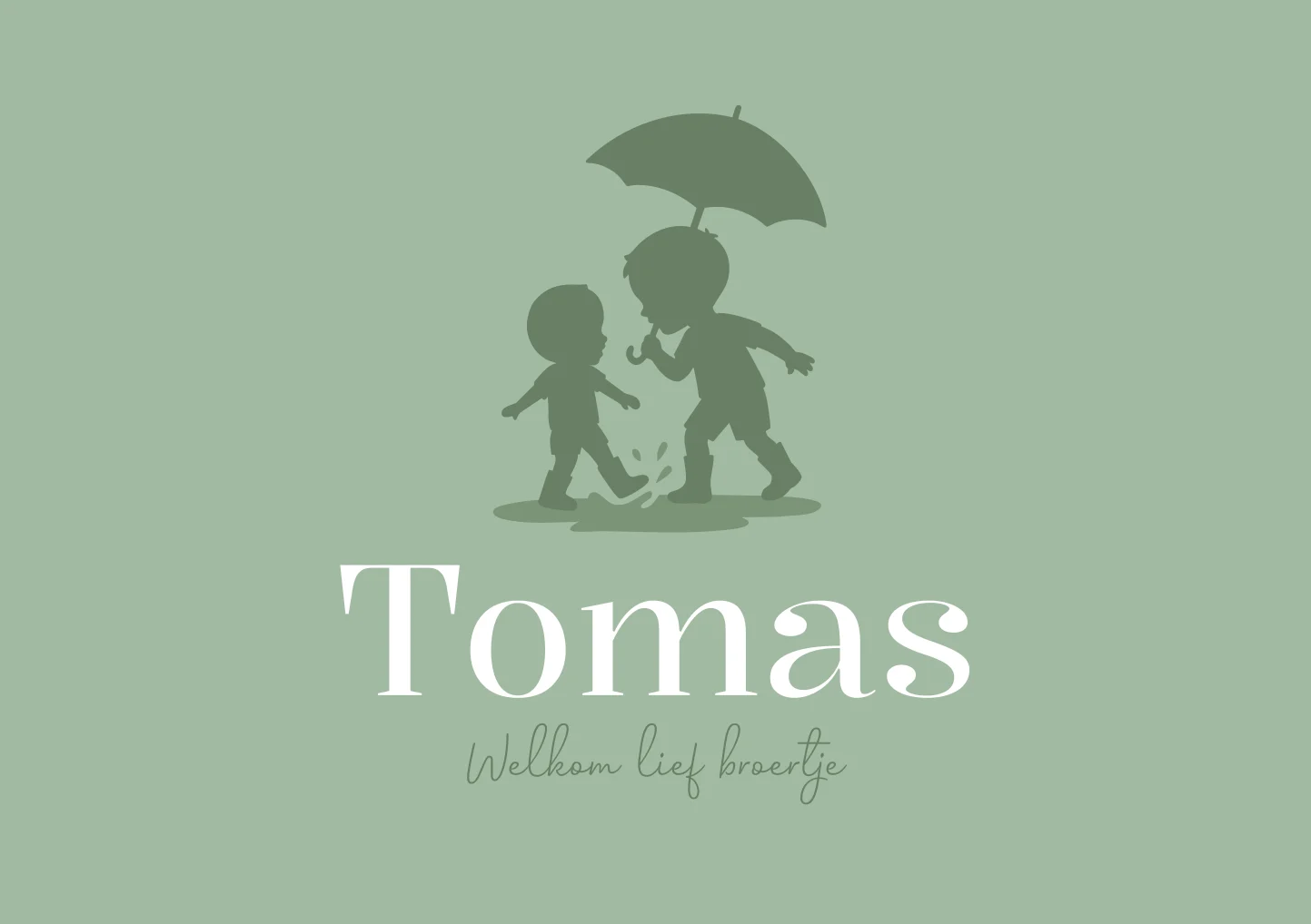 Een regenachtig geboortekaartje waarop Tomas met zijn grote broer in een waterplas stampt. De paraplu laat zien dat het herfst achtig weer is. De kleuren van dit mintgroene geboortekaartje pas je gemakkelijk aan.