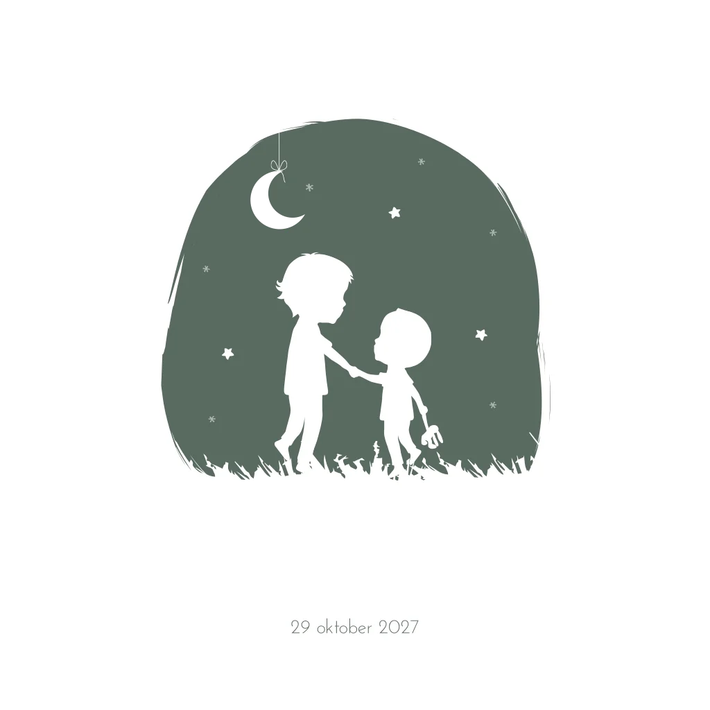Extra bijzonder, een tweede wonder! Een wit met emerald groen geboortekaartje met een silhouet van twee broertjes die worden omringt door sterren en de maan. Kaartje Dimm wordt extra mooi als je de naam, sterren en maan met goudfolie laat drukken.