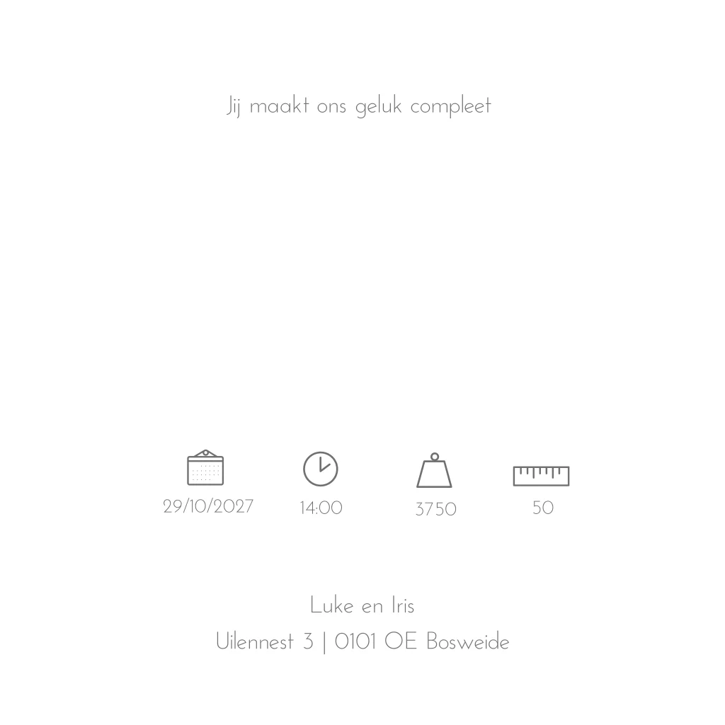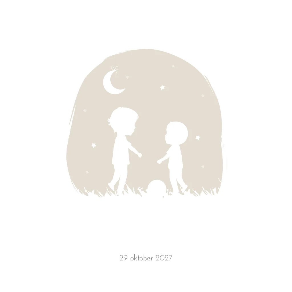 Extra bijzonder, een tweede wonder! Een wit met beige geboortekaartje met een silhouet van twee broertjes die worden omringt door sterren en de maan. Kaartje Brinn wordt extra mooi als je de naam, sterren en maan met koperfolie laat drukken.
