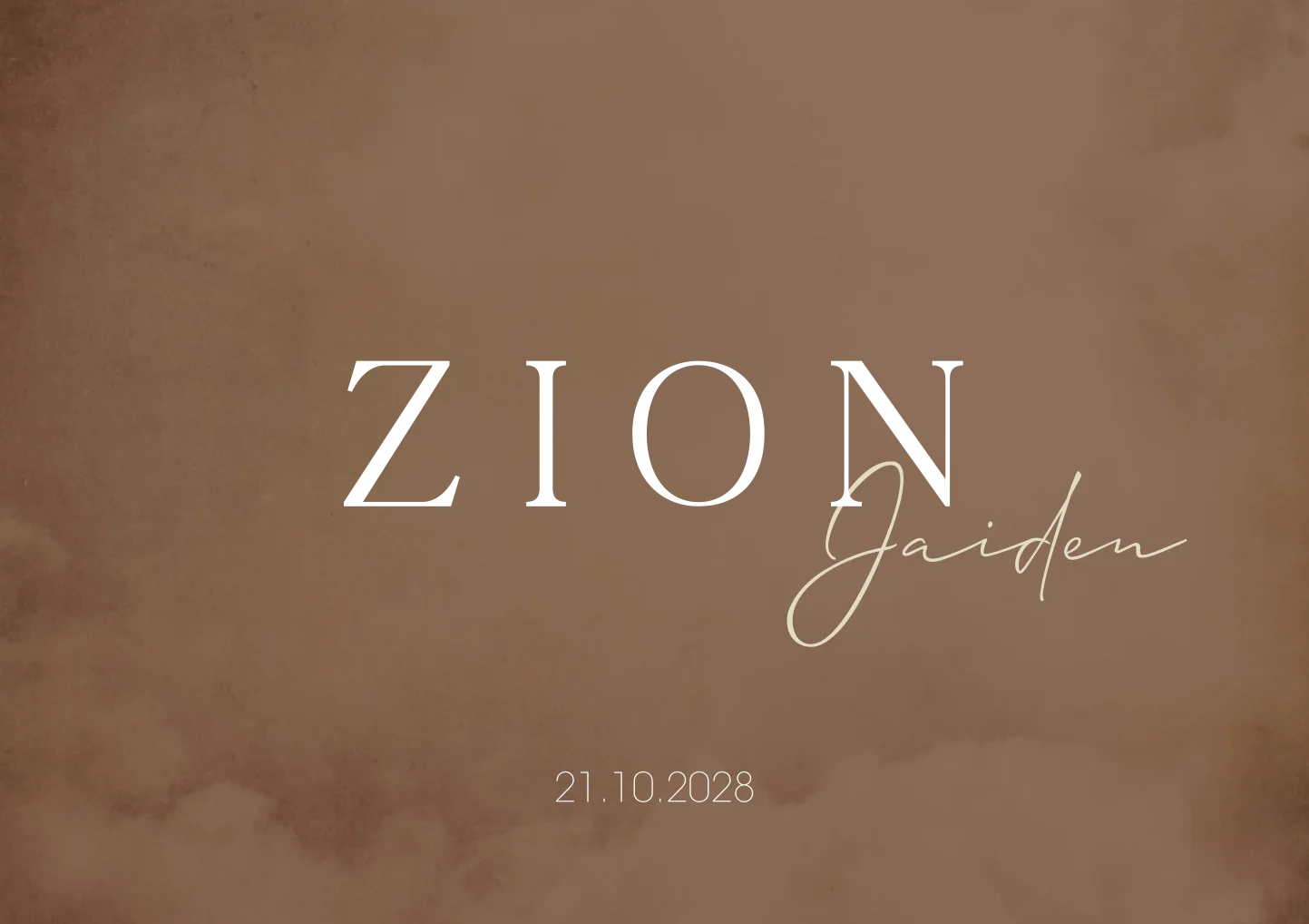 Supermooi en strak donkerbruin gewolkt geboortekaartje Zion Jaiden met chique letters in goudfolie en sierlijke letters voor de achternaam. Pas de kaart aan naar jouw wensen en maak de kaart helemaal eigen in onze editor!