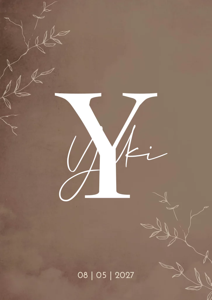 Een donker bruin geboortekaartje met een grote letter als initiaal op de kaart. De speelse takjes maken het kaartje net wat sierlijker. Kaartje Yuki is een modern en strakke kaart. Door de naam in goudfolie te drukken springt deze er extra uit! Wil je hem liever aanpassen qua kleur of opmaak? Dit doe je binnen enkele minuten in onze editor!