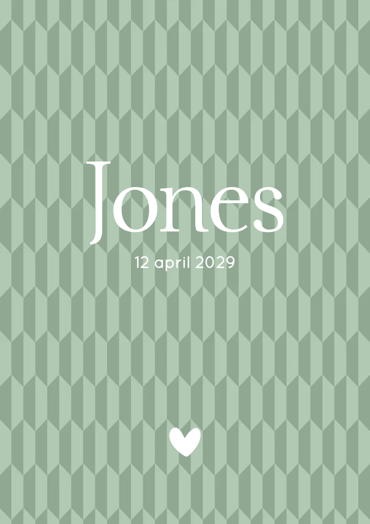 Dit kaartje Jones is helemaal de trend van nu! Het chevron patroon in de mintgroene kleuren zie je vaak terug in interieur en behang voor de babykamer. De kleuren en het patroon kun je heel makkelijk aanpassen.
