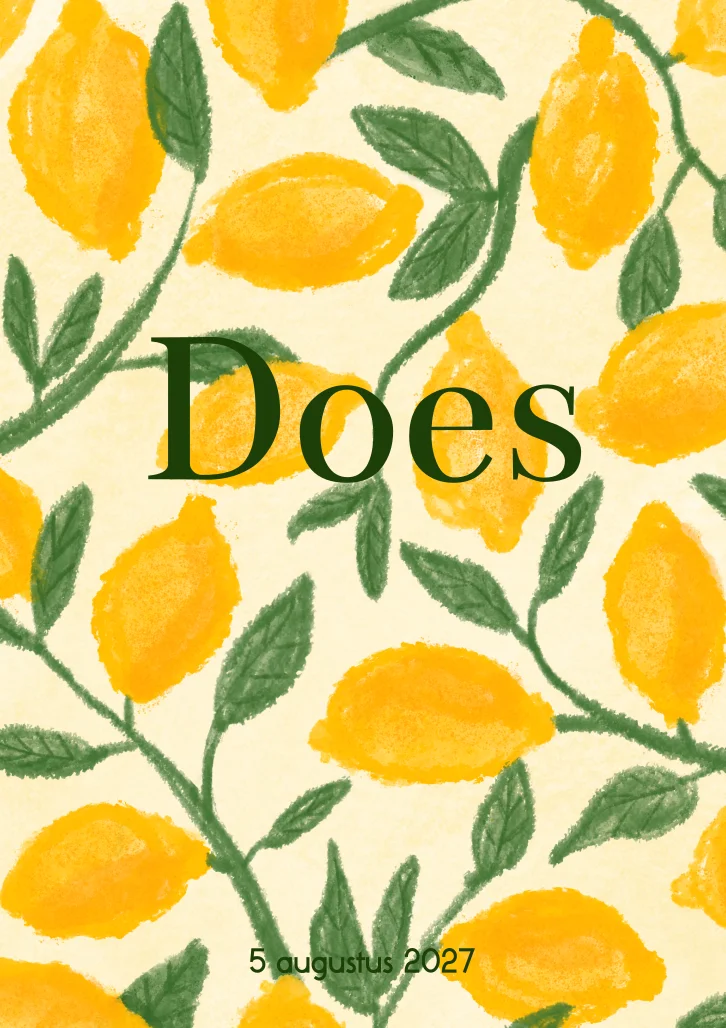 Een fruitig geboortekaartje met een illustratie van een patroon citroenen. De ronde hoeken zorgen voor een hippe uitstraling. Tip: laat de naam in goudfolie afdrukken!
