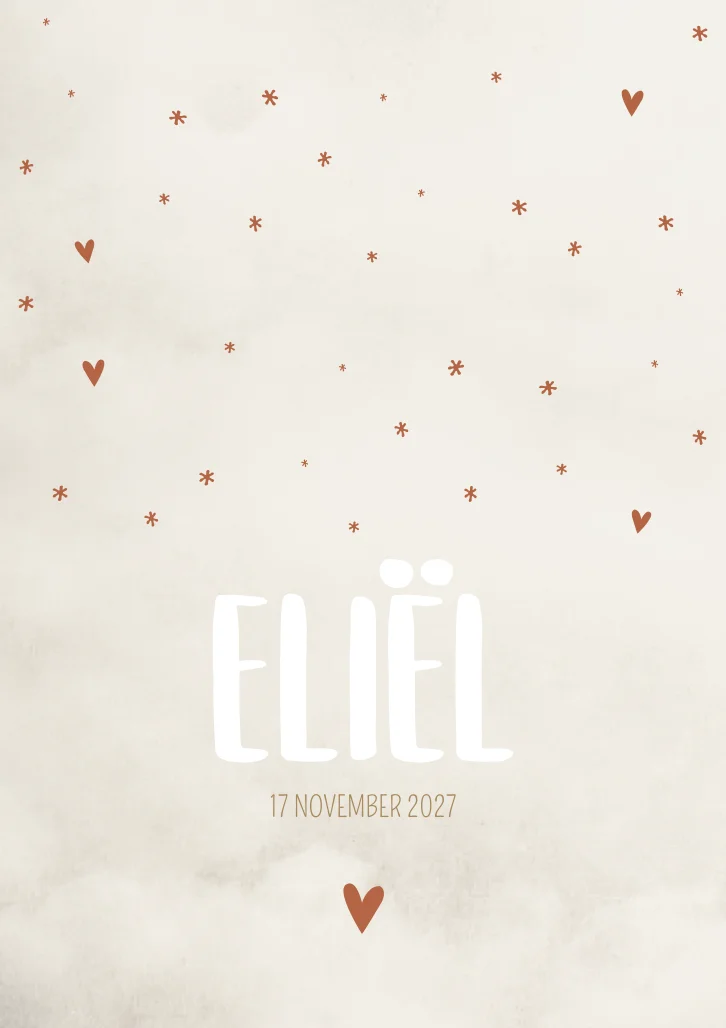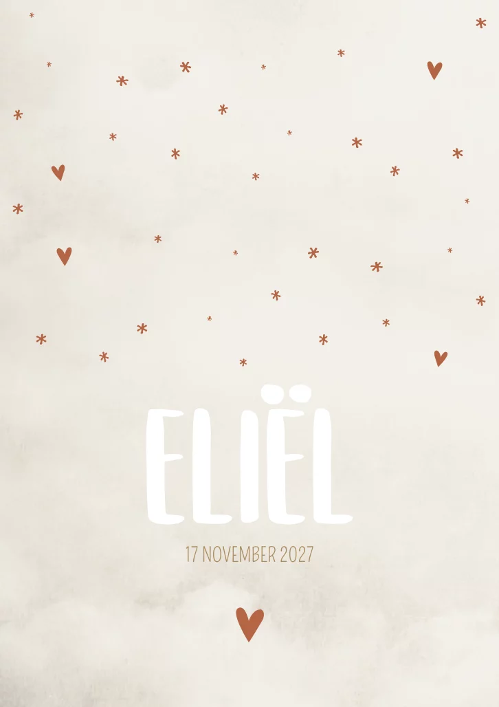 Een gewolkt beige/crème kleurig geboortekaartje. Kaartje Eliël is een neutraal kaartje met lieve hartjes en sterretjes.