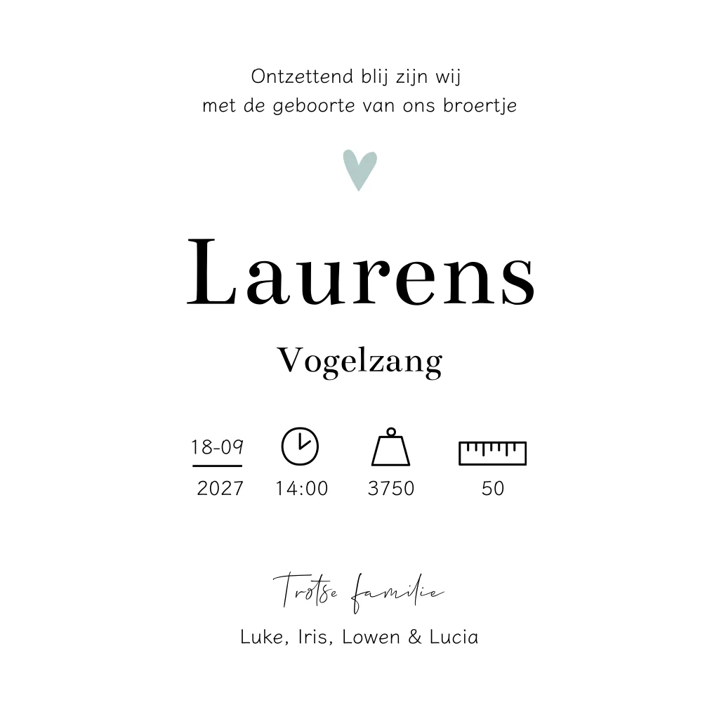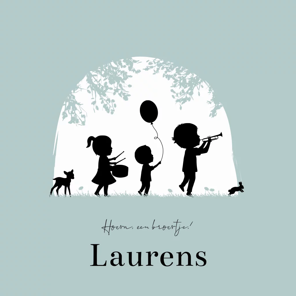 Een vrolijk blauw geboortekaartje met een silhouet illustratie van een grote broer en zus en hun broertje. De grote kindjes spelen muziek met een trompet en drums. Het jongetje houdt een ballon vast. De kindjes worden op kaartje Laurens vergezeld door verschillende diertjes. Je past kaartje Laurens gemakkelijk zelf aan in onze editor. Mocht je toch hulp nodig hebben, neem dan gerust contact met ons op!