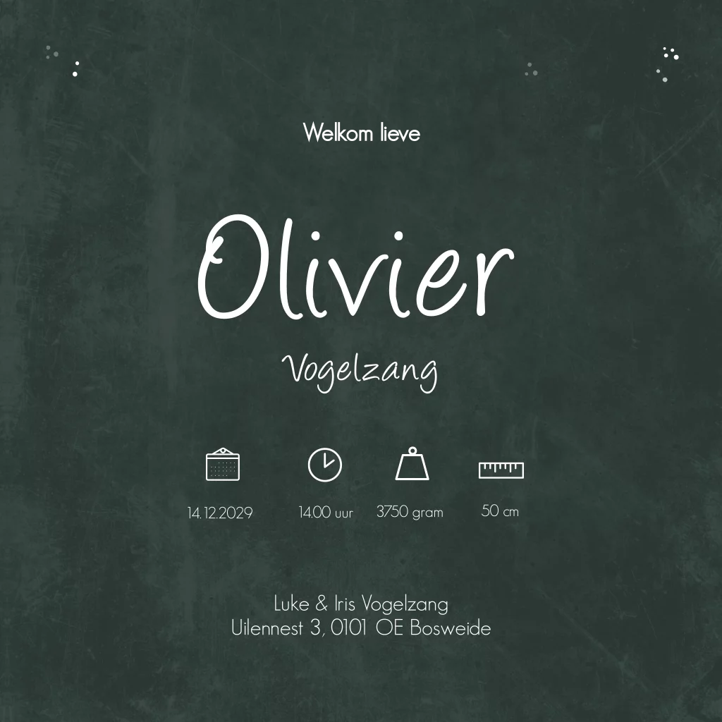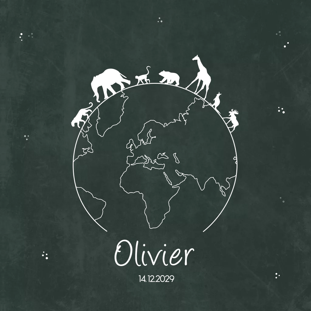 Stoer donkergroen kaartje met wereldbol en dieren. Geboortekaartje Olivier bevat een giraffe, edelhert, kangoeroe, ijsbeer, aapje, olifant en jaguar. Je kan naar eigen wens dieren vervangen in de editor. Wil je dit kaartje liever in een ander formaat? Kies hierboven het gewenste formaat.